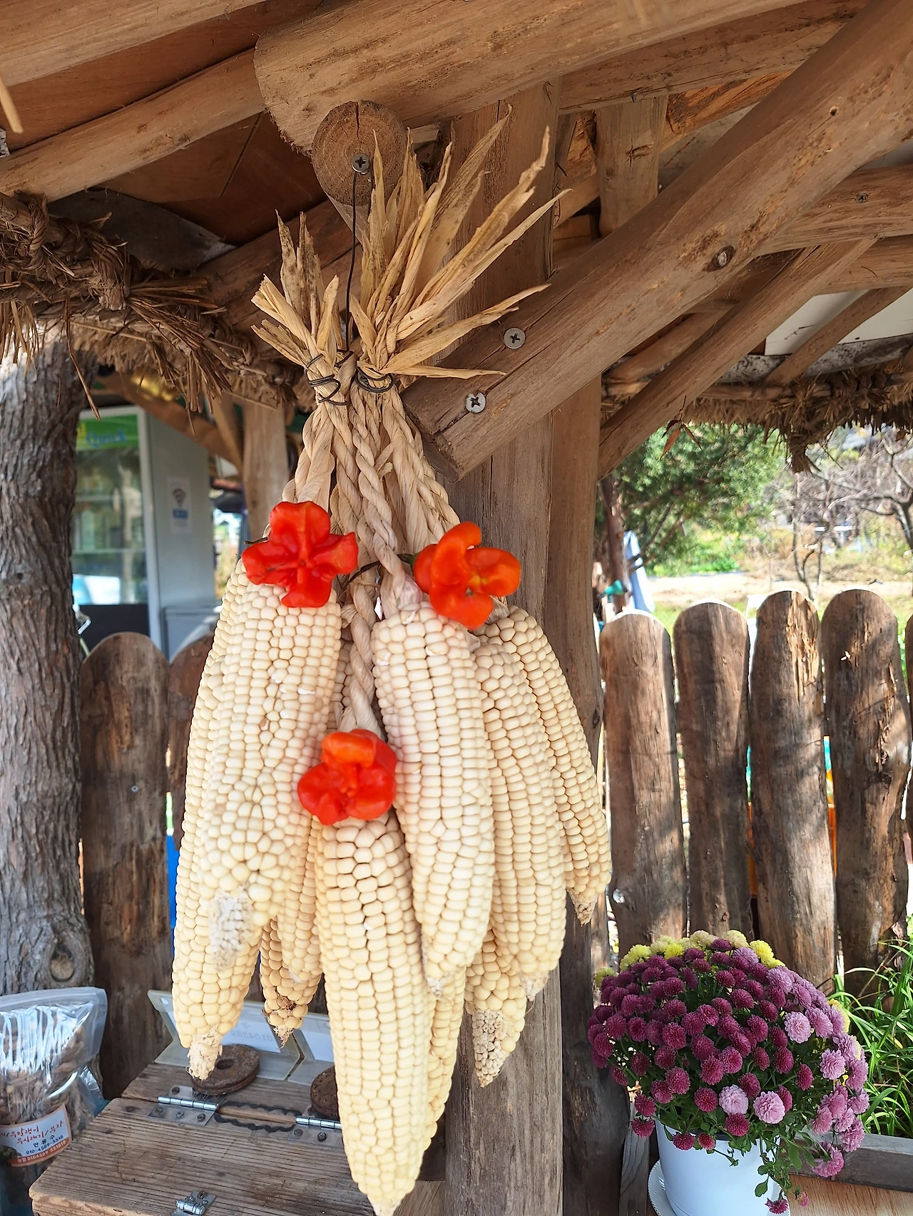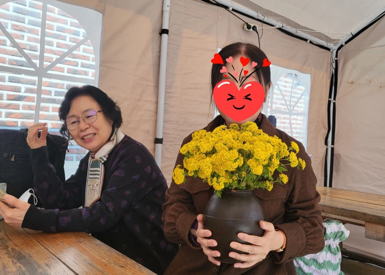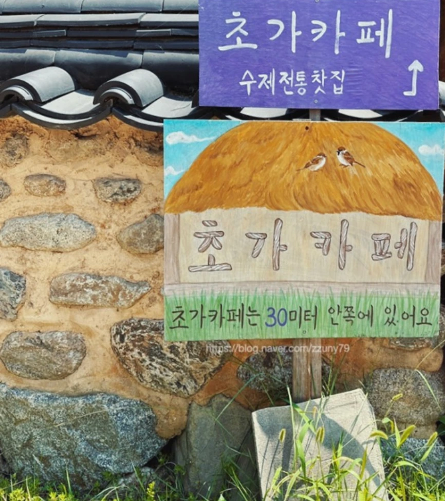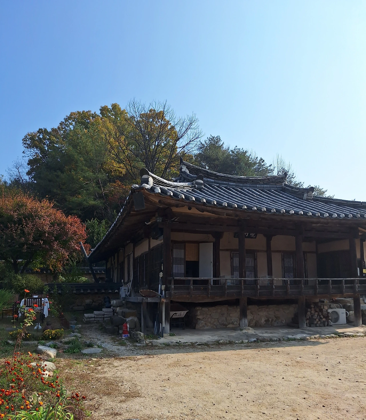 점심 식사를 맛있게 하고 카페를 찾았으나 초가카페 한 군데가 있다. 하지만 초가는 안 보이고 온실처럼 만든 천막 카페에서 커피를? 한옥의 주방에서 커피를 내려 나오는 안주인의 커피맛은 예상외로 커피맛이 좋아 우린 기분이 좋아졌다. 다탁마다 노란 산국, 들꽃을 한 아름 꽂아 놓은 초가 카페에서 커피를 취향대로 마시고 길을 나선다.