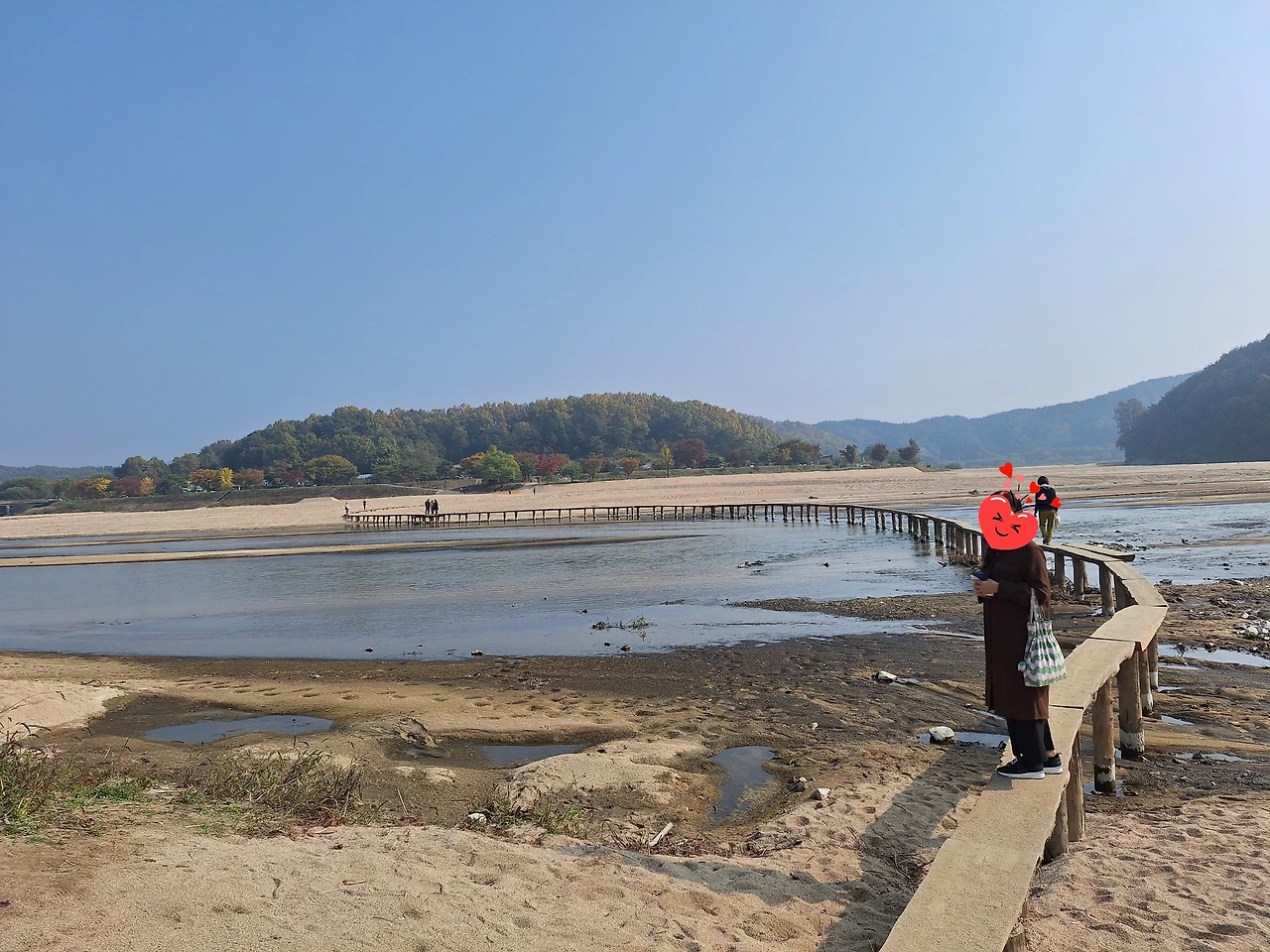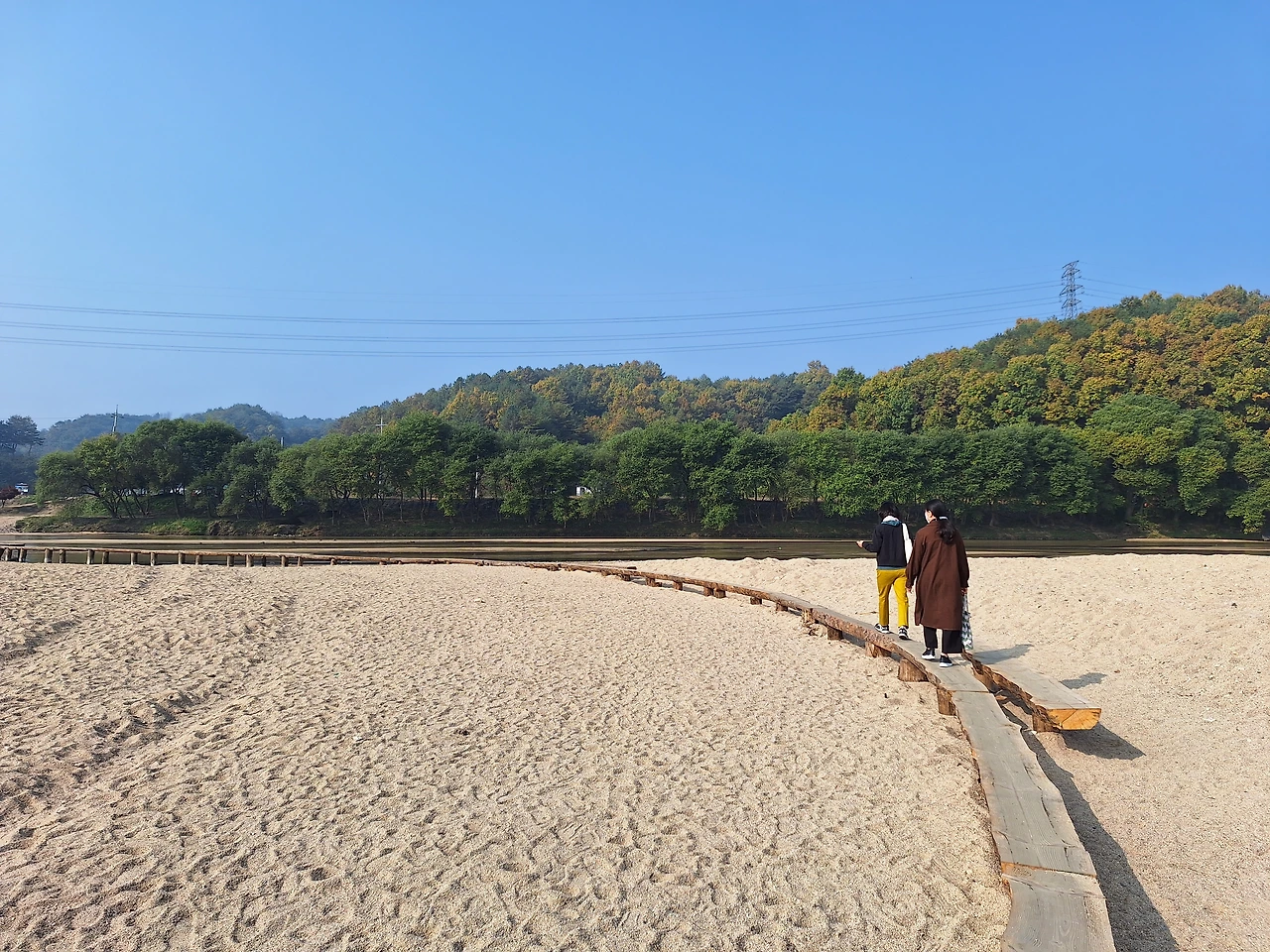 무섬 다리를 건너면서 재미있는 일은 강물이 없는 모래사장 위의 보조 다리 없는 곳에서 마주쳤을 때는 가위바위보 게임을 해서 진 쪽은 발이 푹푹 빠지는 모래밭으로 내려가고 이기는 쪽이 먼저 다리를 지나간다. 지는 사람, 이기는 사람, 모두 유쾌하게 웃으며 건너는 모습을 보니 동심으로 돌아간 듯 재밌다. 그러다 나와 마주친 여행자와는 가위 바위 보 할 수 있는 처지가 아니어서 어쩌지? 하는 사이에 그 남자분은