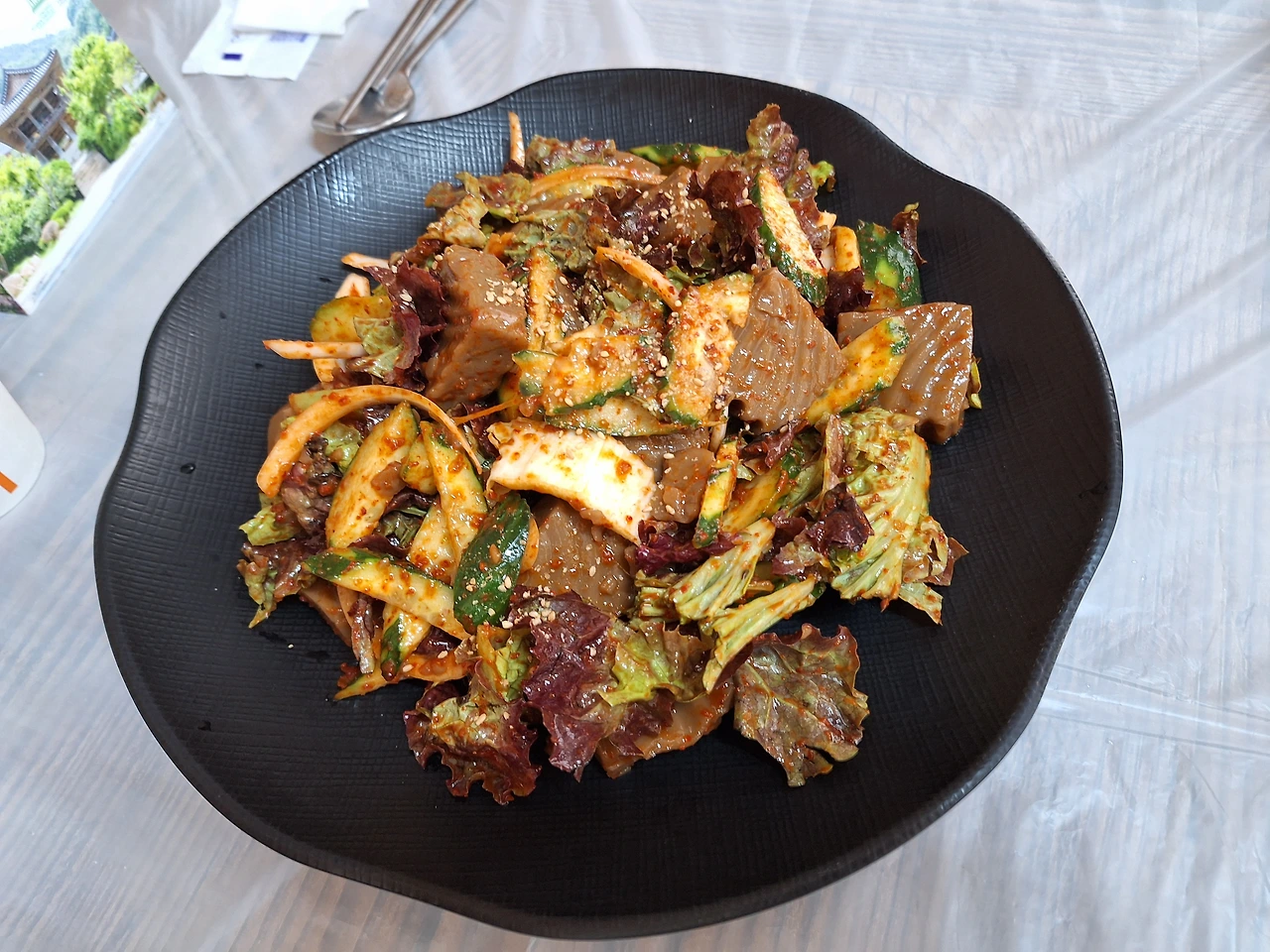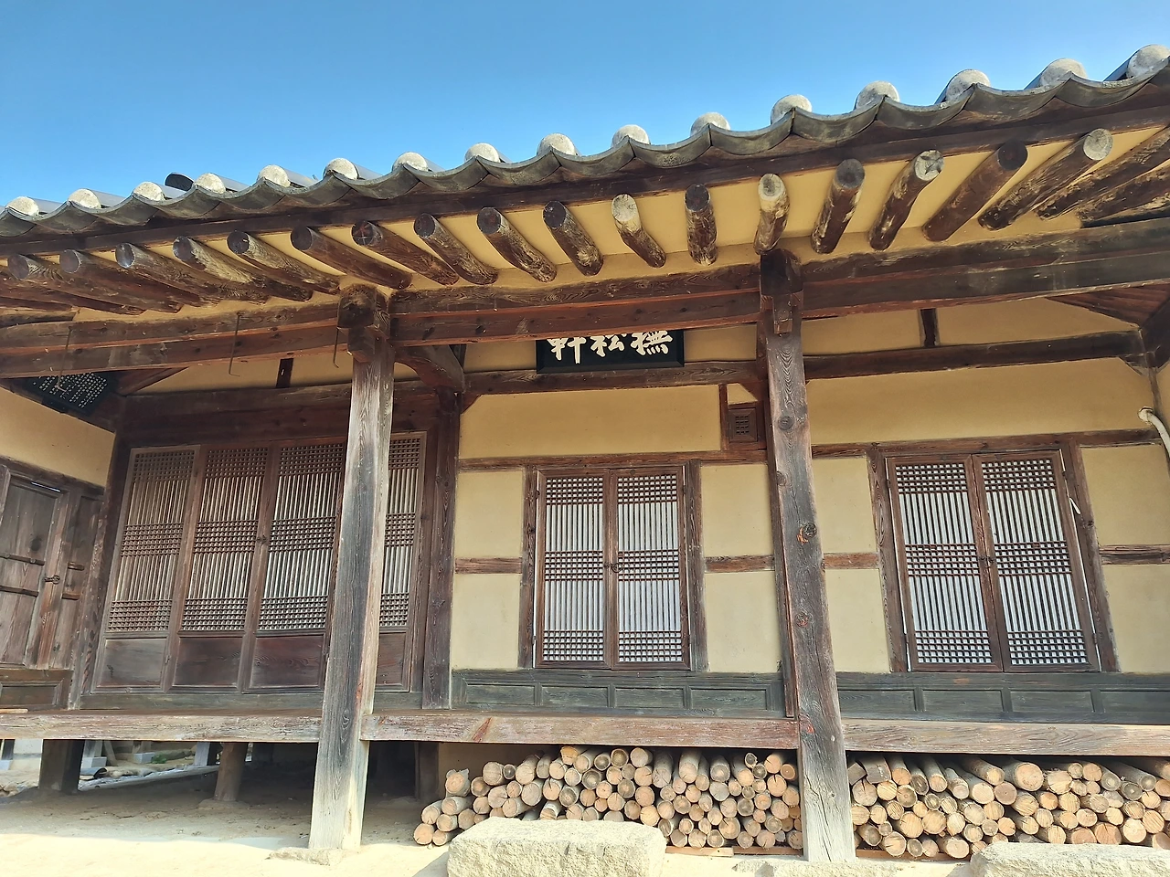 한참 구경을 하다 보니 배꼽시계가 울려 식당을 찾아 나선다. 식당도 여러 곳이 있는 것이 아니어서 선택의 여지가 없는데 도토리묵무침, 야채 전, 청국장으로 비벼 먹는 산채 비빔밥이 맛이 있어 마파람에 게눈 감추듯 먹고 일어나 무섬 마을의 유일한 초가카페로 향한다. 고택들 주변에 새로운 건물을 지어 근린시설을 하는 것 같지 않고 선비촌처럼 이곳에도 고택에 에어컨이 설치되어 있는 것을 보니 한옥 체험을 할 수 있도록 관리되고 있는 것으로 보인다.