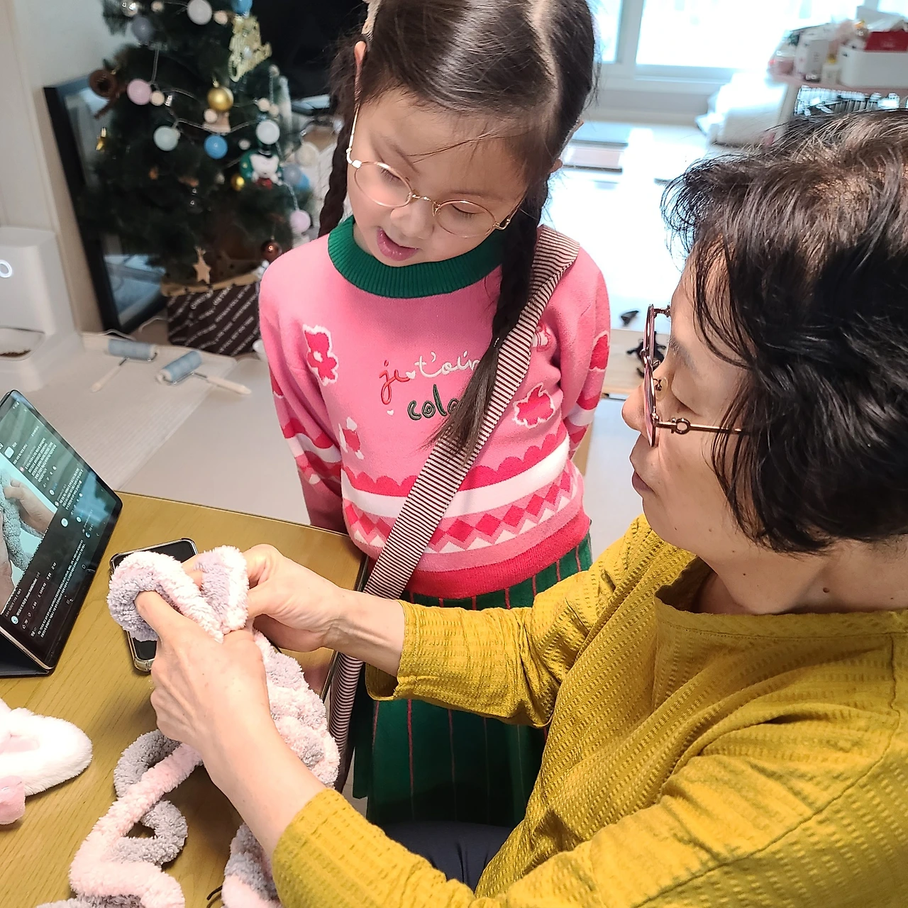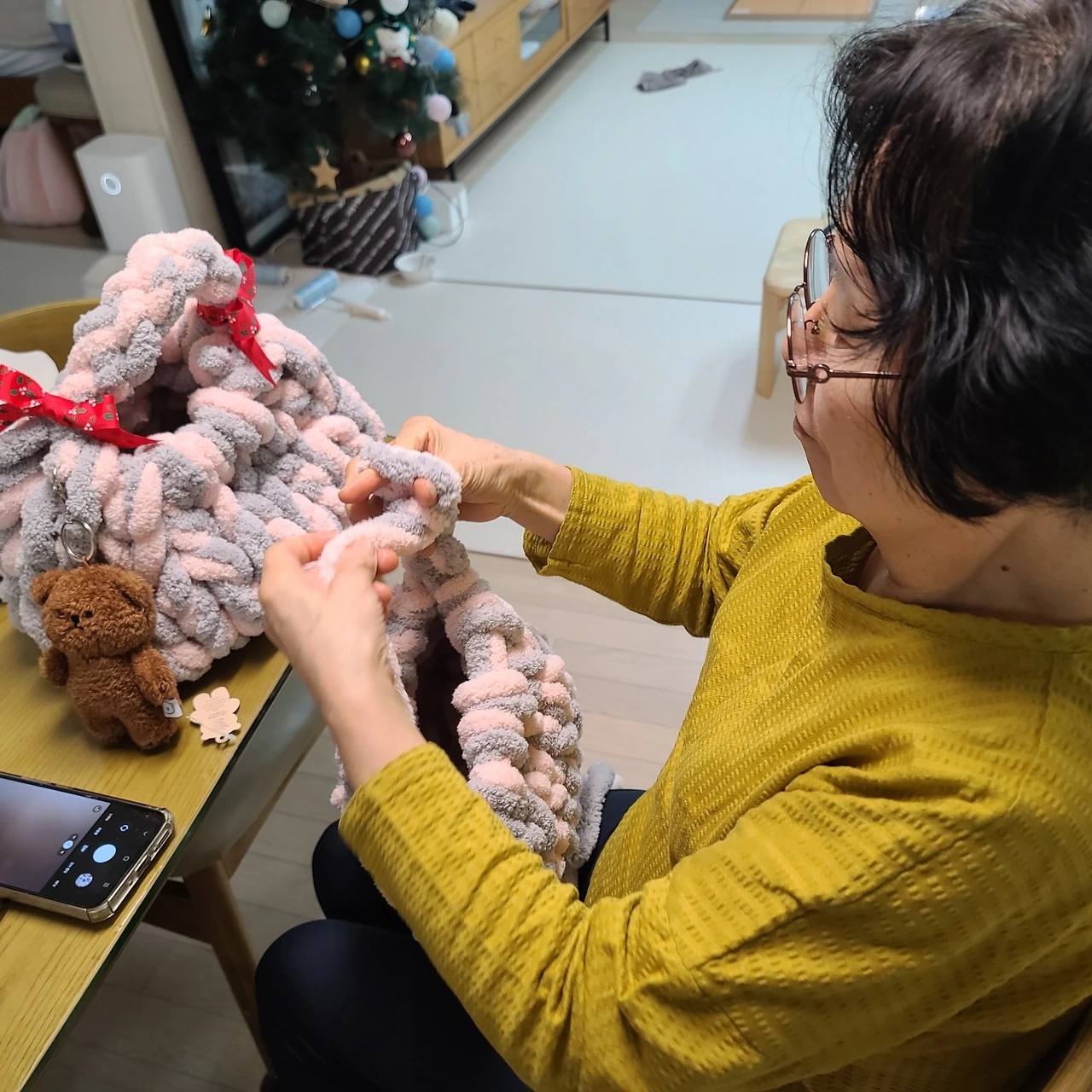 "엄마, 며칠 전에 시어머님이 오셨는데 하율이가 털실을 갖고 와서 할머니, 가방 만들어 주세요 하는 거예요."
