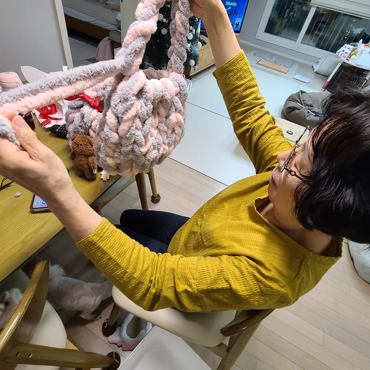 "엄마, 예전에 다나네 집에서 파자마 파티 할 때 다나가 아영아, 손뜨개 가르쳐 줄게 하면서 털실로 이걸 가르쳐 줘서 조그만 목도리를 짠 적이 있어요. 강아지 목에 맞을만한 정도의 크기로. 그런데 가방은 도저히 못 하겠더라고요."