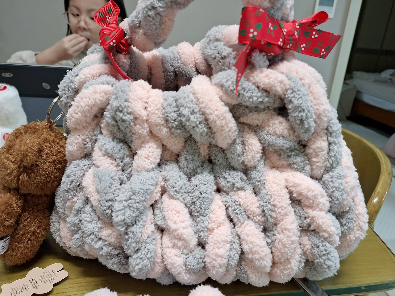 원래 손뜨개를 해보았던 나는 가방 짜기 동영상을 보며 뚝딱 가방 한 개를 만들었다. 하율인 가방에 리본 테이프로 장식을 하고 곰인형까지 달고 폴짝폴짝 뛰며 좋아했다.