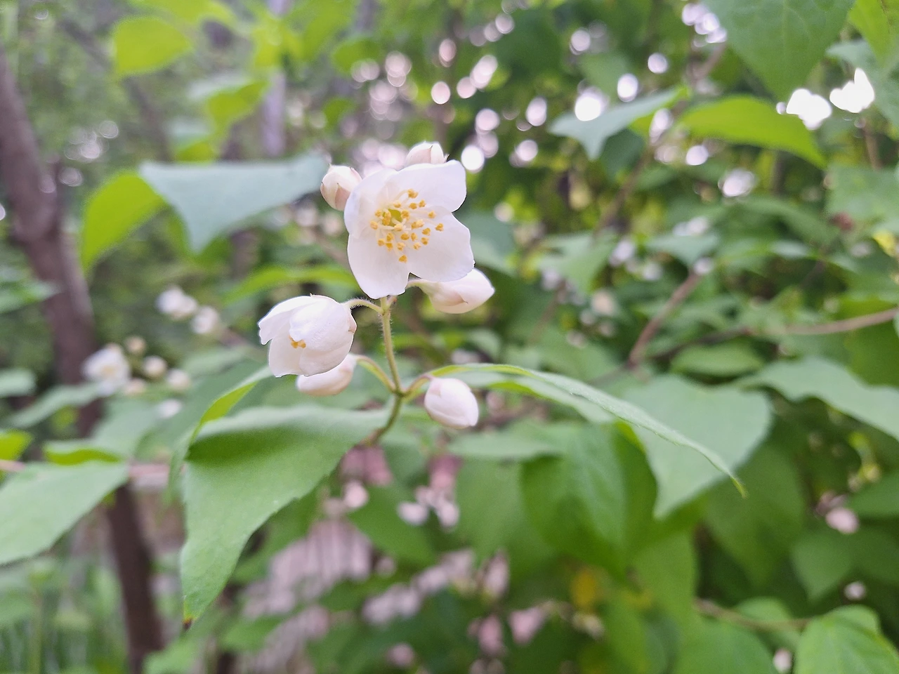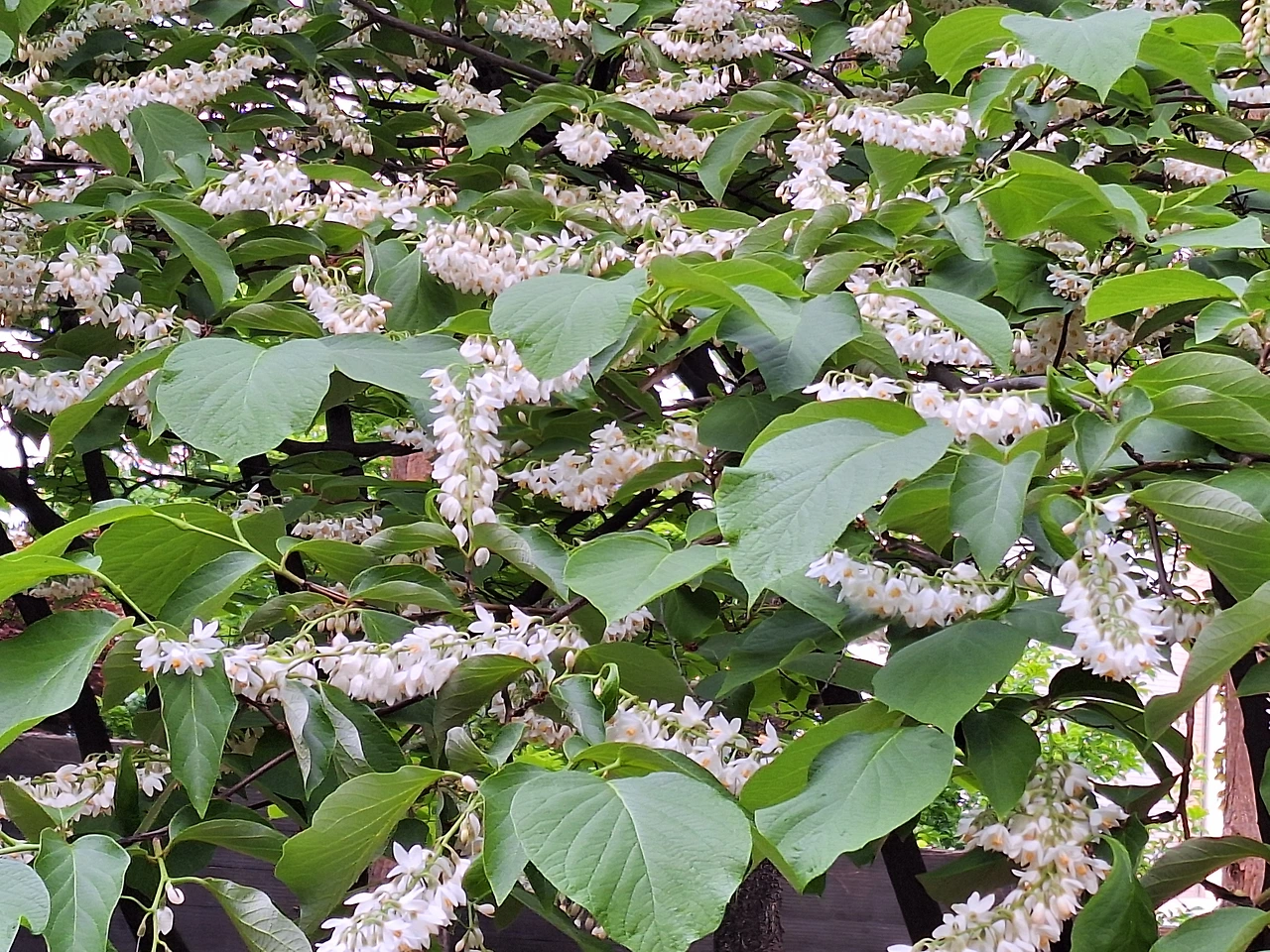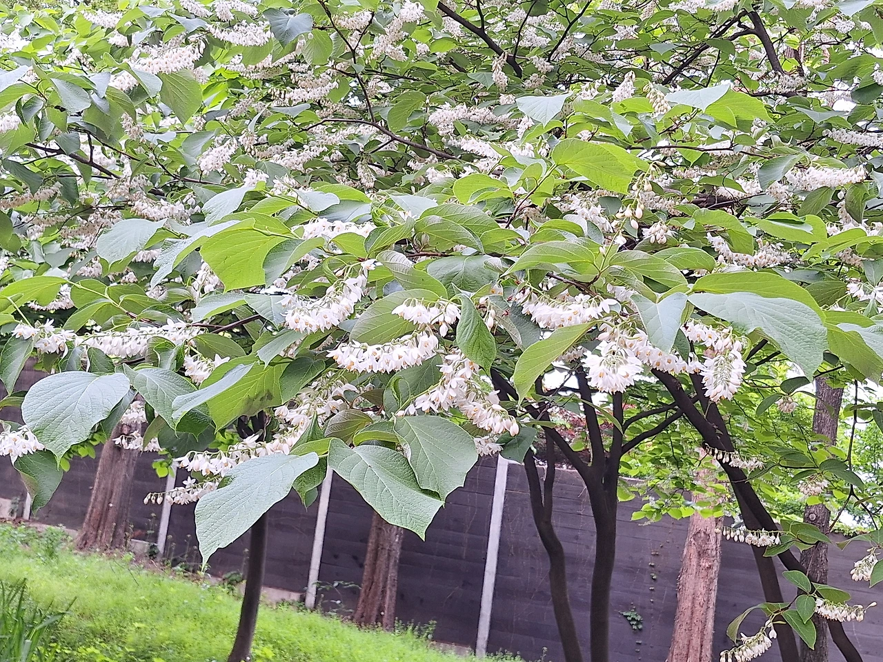 저 앞에 동글동글 하얀 꽃, 불두화나무의 손짓 따라가는 길 도랑가 위에 주렁주렁 포도송이처럼 늘어진 흰꽃송이는 무얼까? 때죽나무꽃? 흰말발도리꽃인가 짐작을 하며 가까이 가서 보아도 모를 꽃일세 그려. 얼른 검색을 해보니 쪽동백이란다.