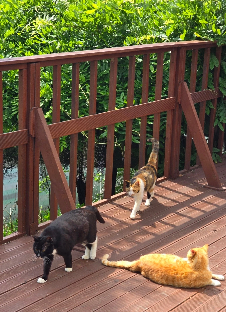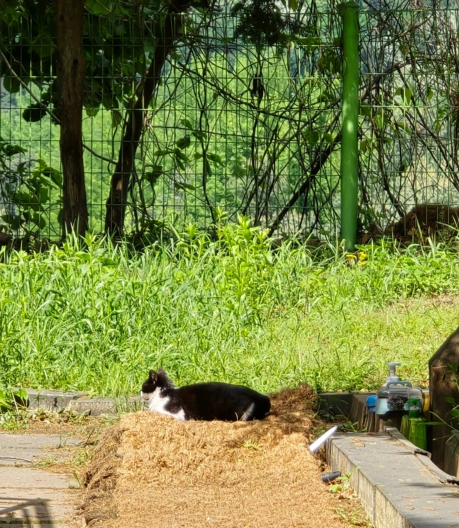 카네이션을 꽂아 드리고 엄마, 아버지 자식 걱정 이제 하지 마시고 편안하게 계시라고 인사하고 난 후 우린 부모님 덕분에 망중한을 즐겼다. 승화원 주변은 소소한 꽃들이 시선을 끌고 더 많은 고양이들이 자기들의 쉼터처럼 고요하고 평화롭게 쉬고 있는데 옆에는 물까치 두 마리가 놀러 왔다.