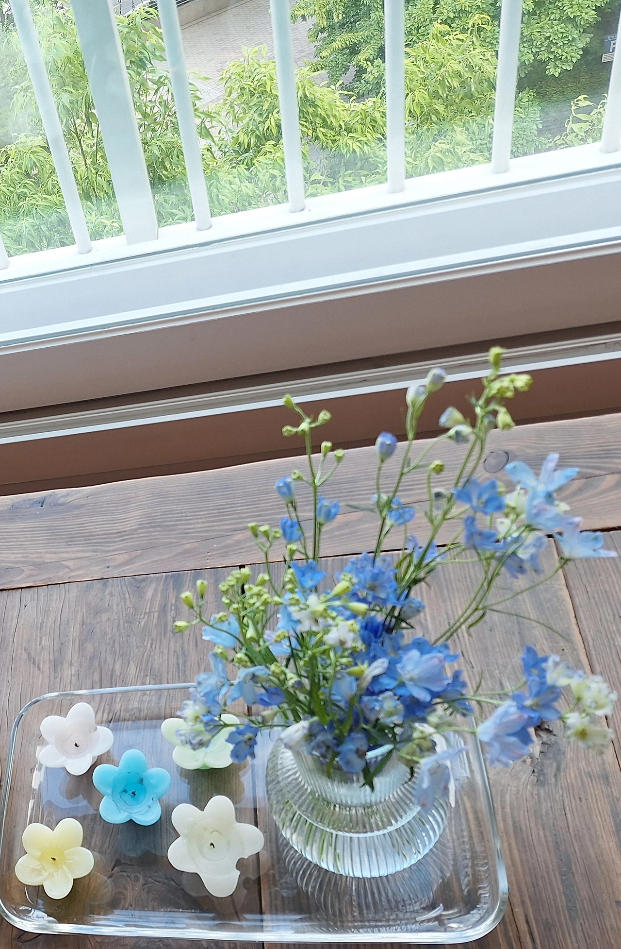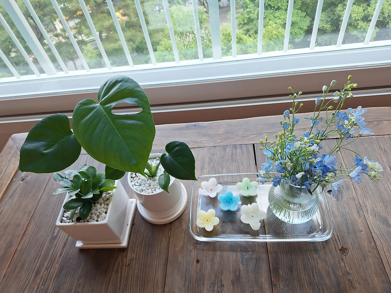 담쟁이 화분에 마음을 빼앗기고 델피니움 종류의 푸른색 꽃은 꽃집 사장에게 선물로 받았다.