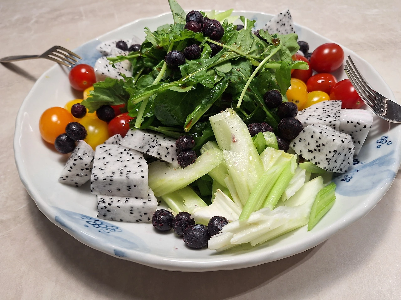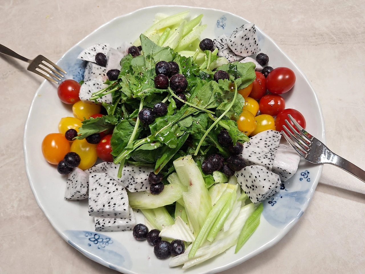 올리브유를 쓰지 않고 특별한 바질 오일을 뿌렸다. 그냥 먹으면 밋밋할 수 있는 용과까지 넣으니 화련하고 멋진 샐러드가 탄생했다. 흰색 발사믹으로 마감하고 맛나게 먹는 행복한 일만 남는다.