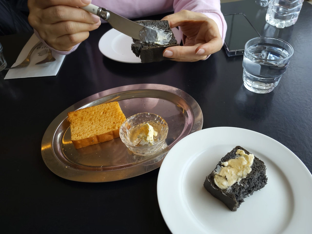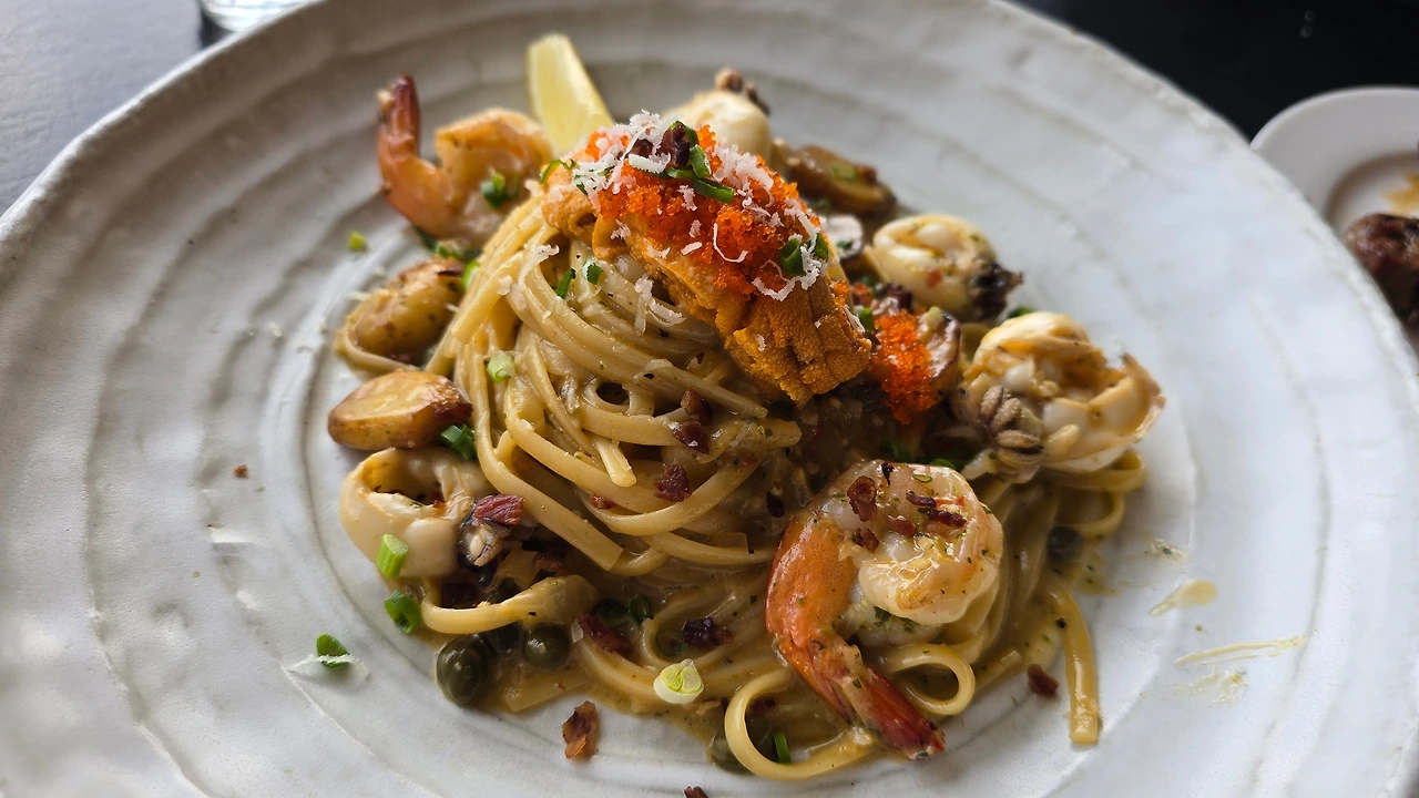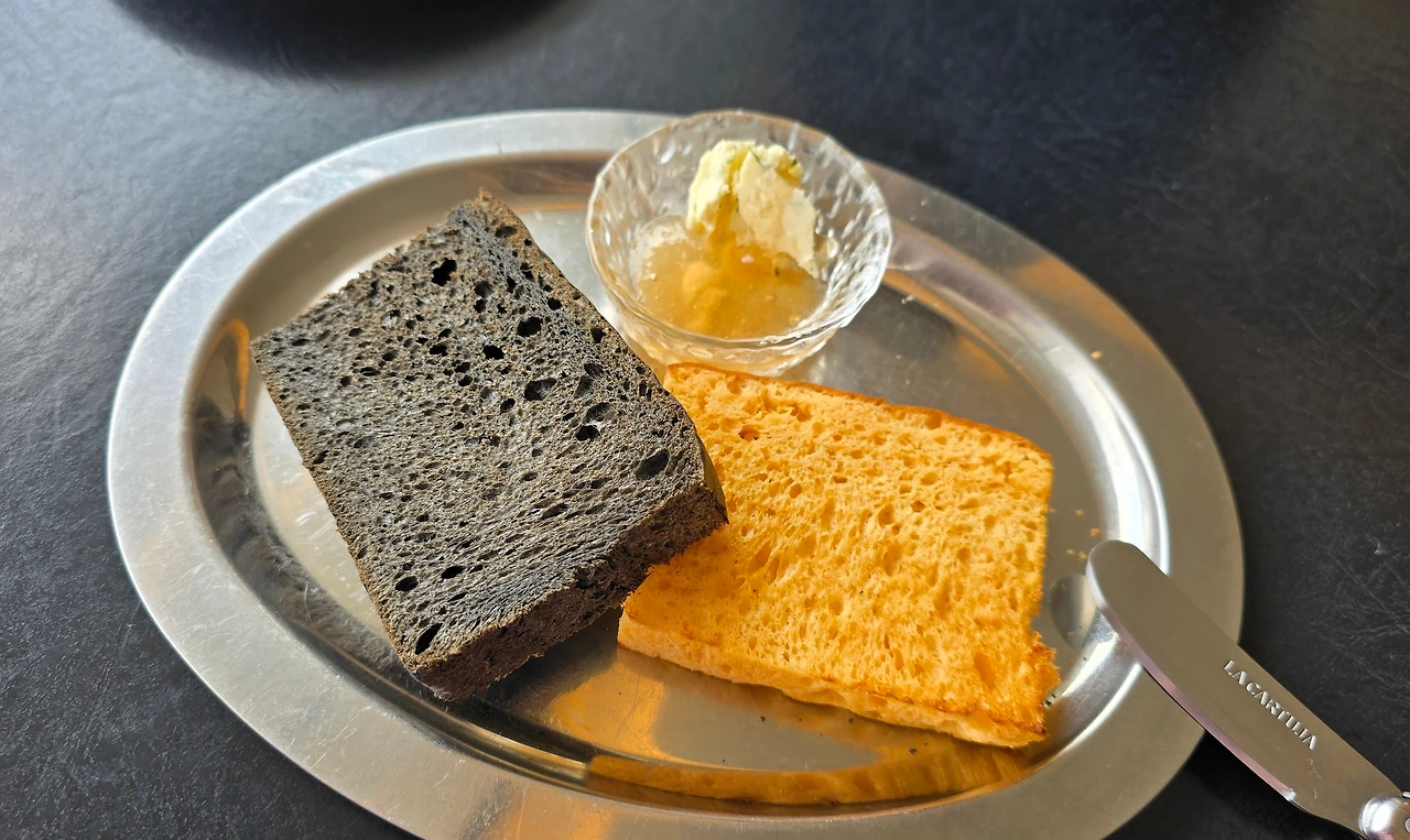 현대식 기와지붕 아래로 빛이 길게 내려앉는 곳이다. 딸은 가만히 메뉴판을 보더니 두 사람인데도 성게알 파스타, 만조샐러드, 가지 요리(이름을 잊음). 세 개를 주문한다.