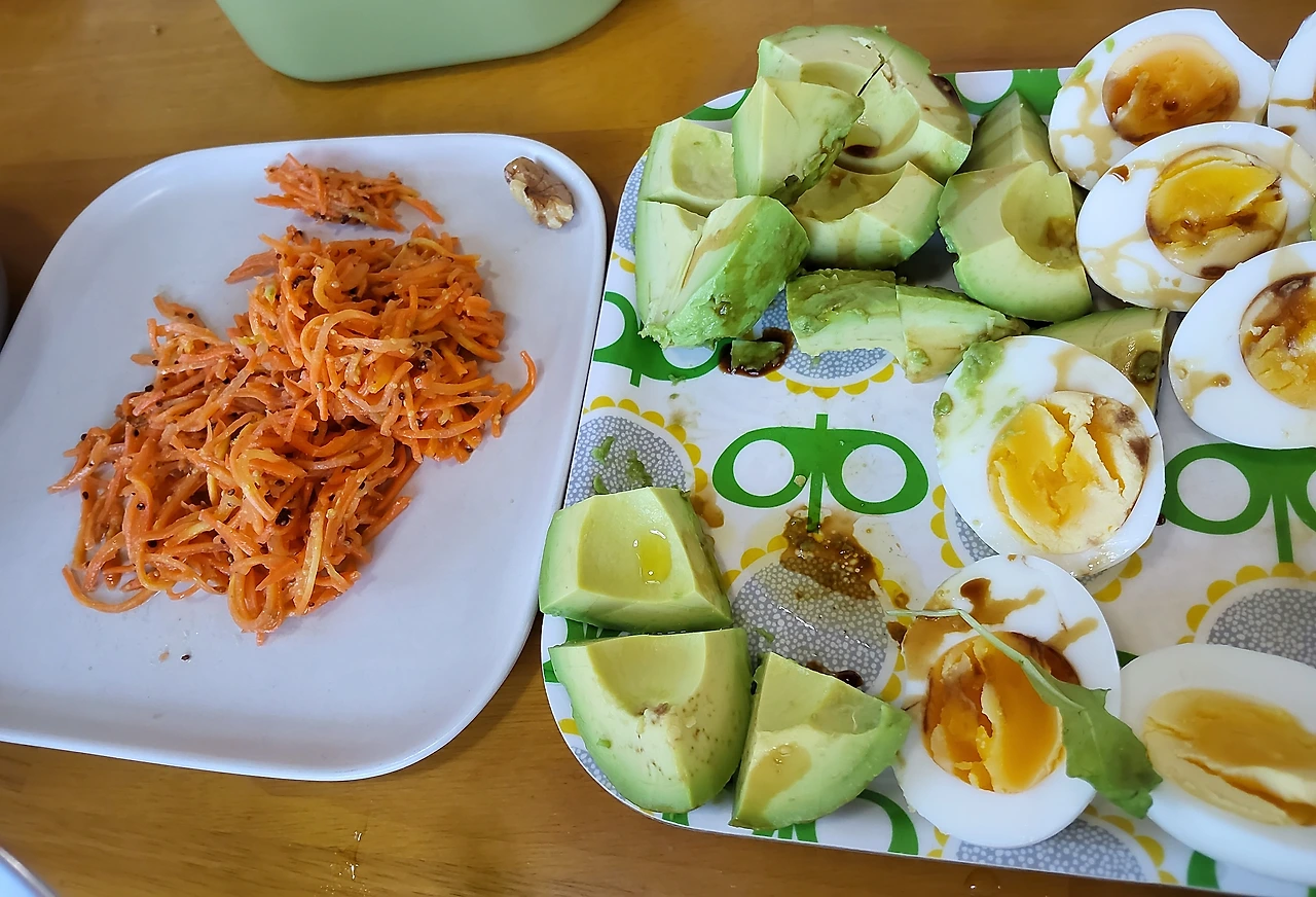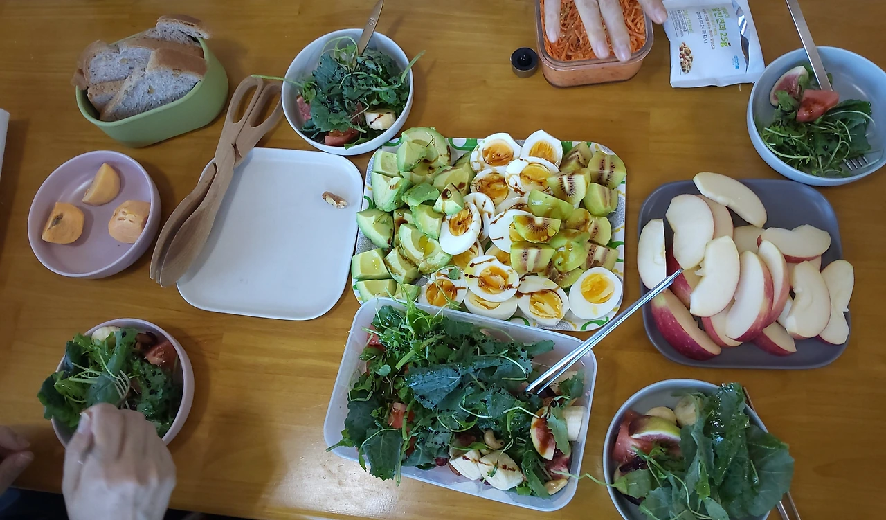 이튿날 산책을 마치고 숙소로 돌아오니 아침 식탁이 풍성하게 차려져 있었다. 신선한 채소 샐러드, 정아 씨 남편이 직접 구운 통밀빵, 그리고 향숙 씨의 특허품 당근 라페, 갖가지 챙겨 온 샐러드 재료들. 글벗들의 손길로 준비된 식탁 앞에서 괜히 미안하고 고마운 마음이 동시에 올라왔다. 그 마음을 숨기듯 헤헤 웃으며 좋아하는 샐러드를 아낌없이 먹고, 접시에 남은 소스까지 설거지하듯 빵으로 싹싹 문질러 먹었다. 때맞춰 정아 씨가 내린 커피가 입안에서 천천히 퍼지자 여행의 여유를 완성시키는 기분이 드는 최고의 아침이었다.