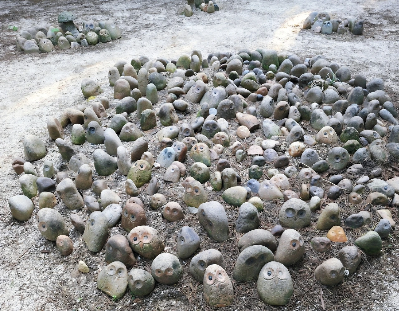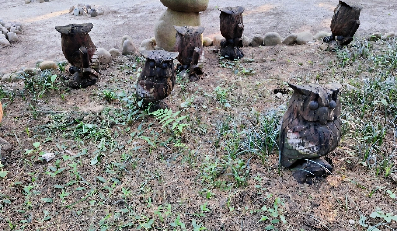 지혜의 정원에는 다양한 표정의 부엉이 조각상들이 모여 있다.