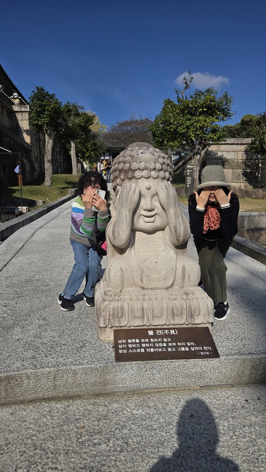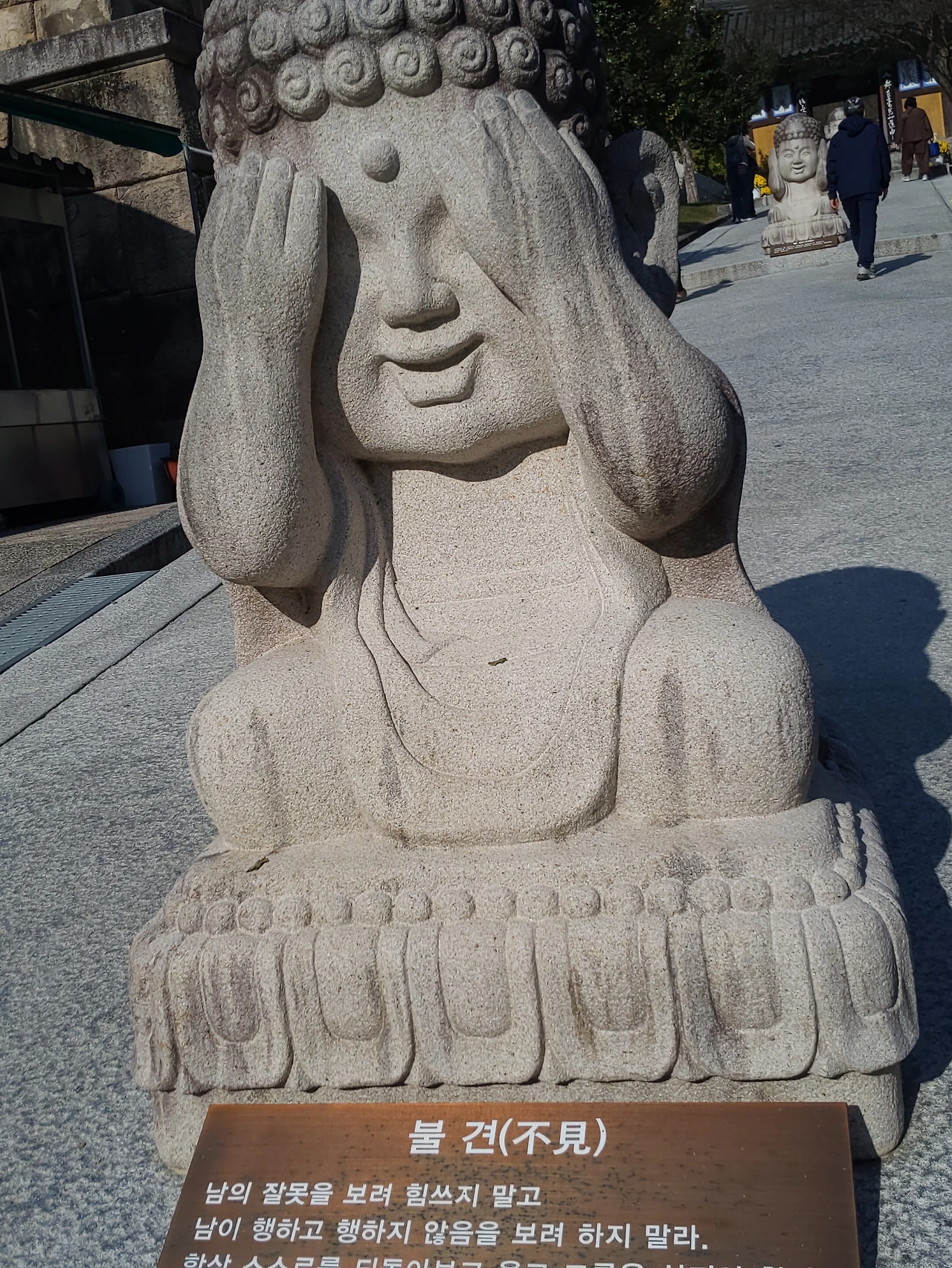 대웅전까지 이어진 경내의 완만한 언덕, 그 길목에 세 개의 동상이 서 있었다. 눈을 가린 모습, 귀를 막은 모습, 입을 다문 모습. 익숙한 형상이었지만, 이곳에서는 유난히 발걸음을 멈추게 했다.
