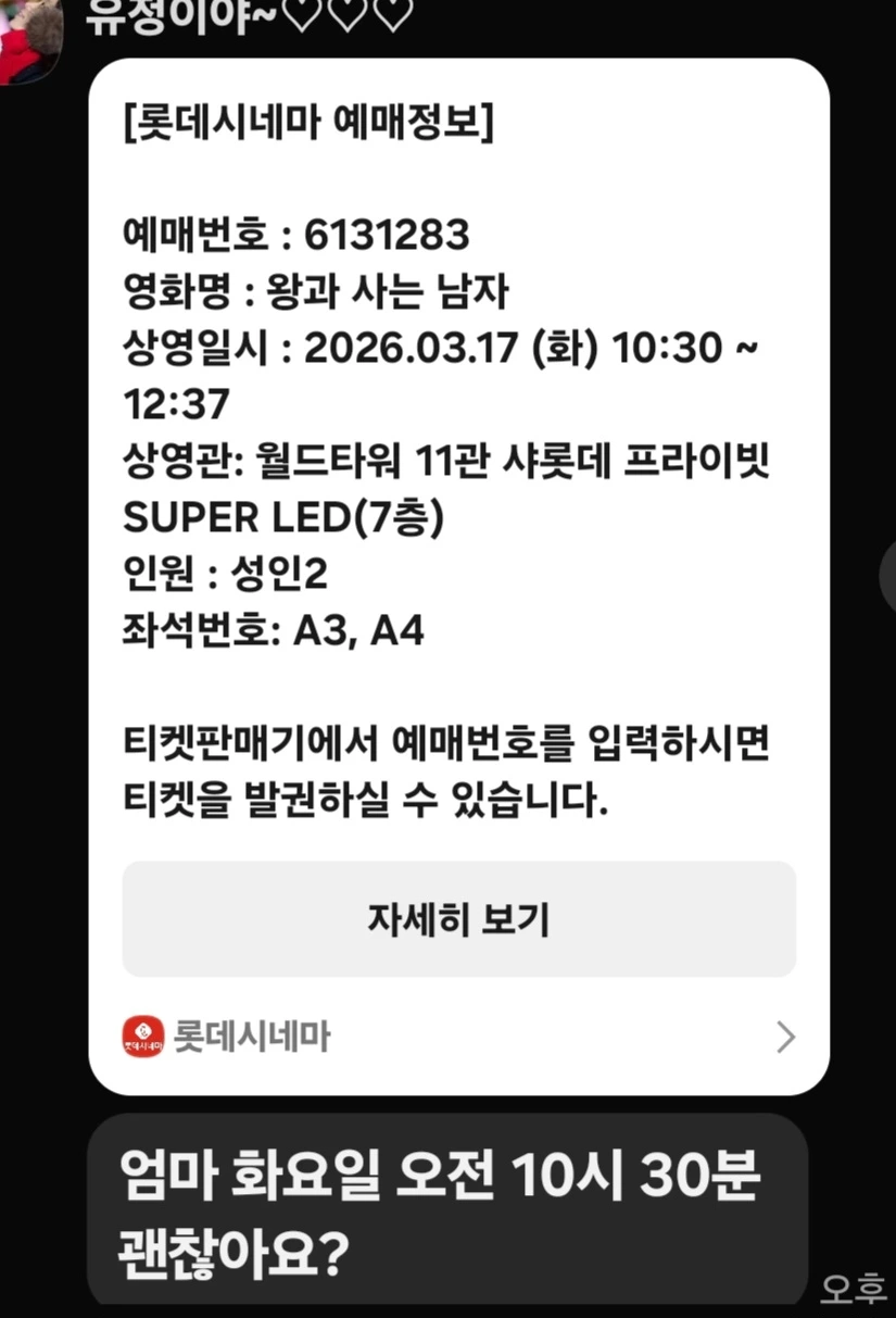 내 휴무일에 맞춰 막내딸이 미리 예매를 해두고 연락을 했다.