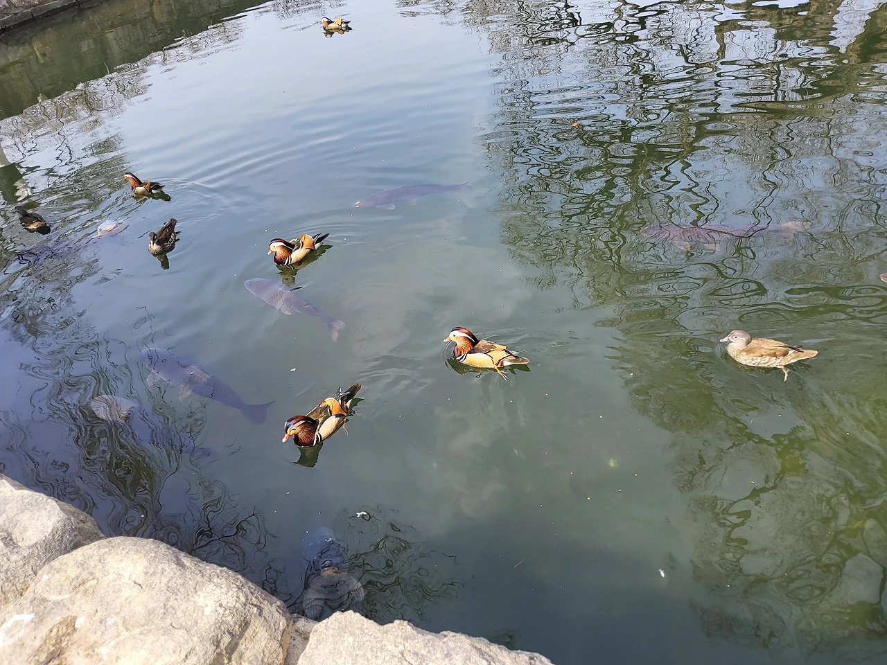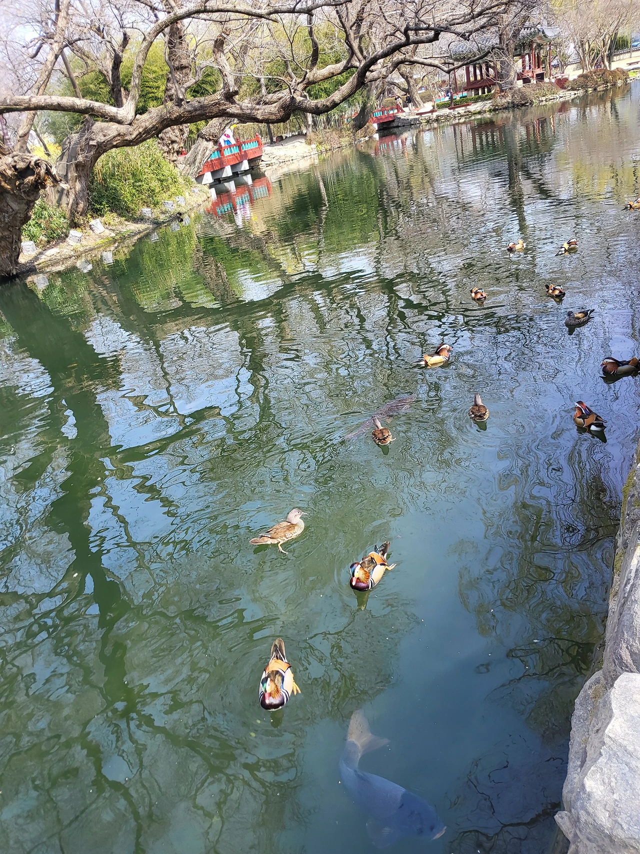 그 위로는 색이 유난히 또렷한 수컷 원앙들이 떠다녔다.