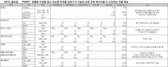 그리고, 오늘의 근육운동은 상체운동을 하는 날이었는데, 걸음 연습 및 스트레칭 시간을 추가하다 보니 시간이 많이 오버되어 어깨 운동을 매주 두 번 있는 유산소 운동 day에 포함시키는 게 효율 적일 것 같다는 생각을 하였다. 그래서 이번 주부터는 1 day- 유산소, 가슴, 복부 / 2 day- 유산소, 어깨, 복부 / 3 day - 유산소, 하체, 등으로 두번의 사이클을 도는 4주 차 운동 일정을 진행하면 될 것 같다.