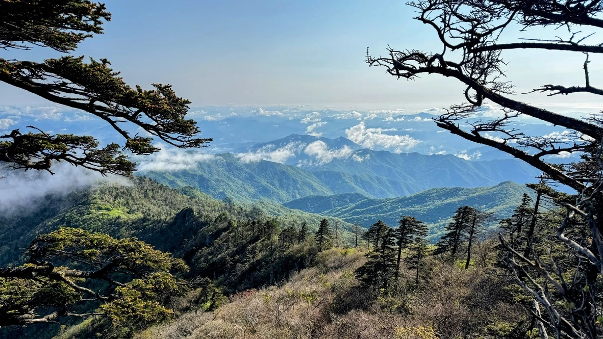 구상나무 가지 사이로 내려다 보는 동부능선엔 봄기운이 퍼지고,