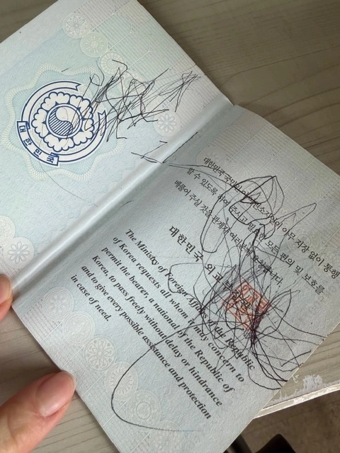 누가 엄마의 여권에 이렇게 예쁘게 낙서를 했을까.