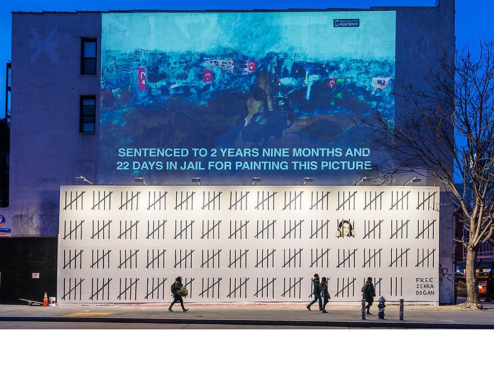 뱅크시는 자국에서 출품한 그림으로 인해 수감된 터키 아티스트 제라 도간의 충격적인 사건을 상징적인 뉴욕 한복판에서 벽화를 통해 표현하고 전달함으로써 자신만의 저항 방식을 보여주었다.