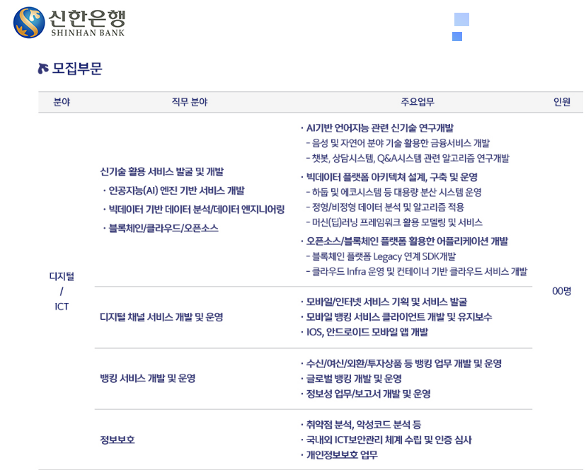 내가 알아본 기업정보를 줄줄줄 나열하는 형식이다. 또 정보만 나열하기는 민망했는지 간혹 '성장' 이라던지, '도전정신' 등 기업의 인재상을 어거지로 끼워 맞추며 해당 기업이 좋았다고 말한다. 열심히 기업정보를 분석한 것 자체는 칭찬해 주고 싶으나, 이런 지원동기를 쓴 사람은 결국 기업정보를 분석하는 의미를 잘못 이해하고 있는 것이다. 열심히 조사한 기업 관련 정보를 최대한 많이 작성하는 것이 지원동기가 아니다. 내가 분석한 기업정보 중에서 나와 가장 접점에서 매칭되는 유의미한 정보 값을 찾아내는 것. 그것이 지원동기이다. '신한은행 - 디지털/ICT'직무를 예로 들어보겠다.