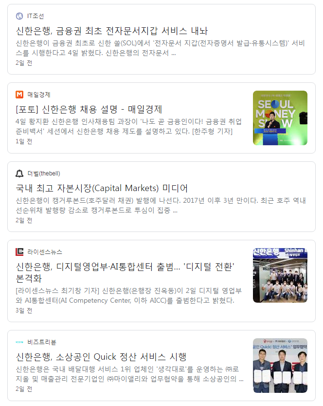 [신한은행, 2020년 디지털/ICT직무 채용정보]신한은행에 대해 열심히 조사해야겠다고 생각한 당신은 신한은행의 홈페이지, 전자공시시스템(Dart), 최근 뉴스는 물론 심지어 유로로 기업분석보고서까지 사서 분석해보았다. 나름대로 SWOT 분석까지 해보며, 신한은행에서 발전을 도모하고 있는 기술관련 이슈들로 지원동기를 작성해보자고 마음먹었다. 그리고 아래와 같은 정보 값들을 추출하였다.