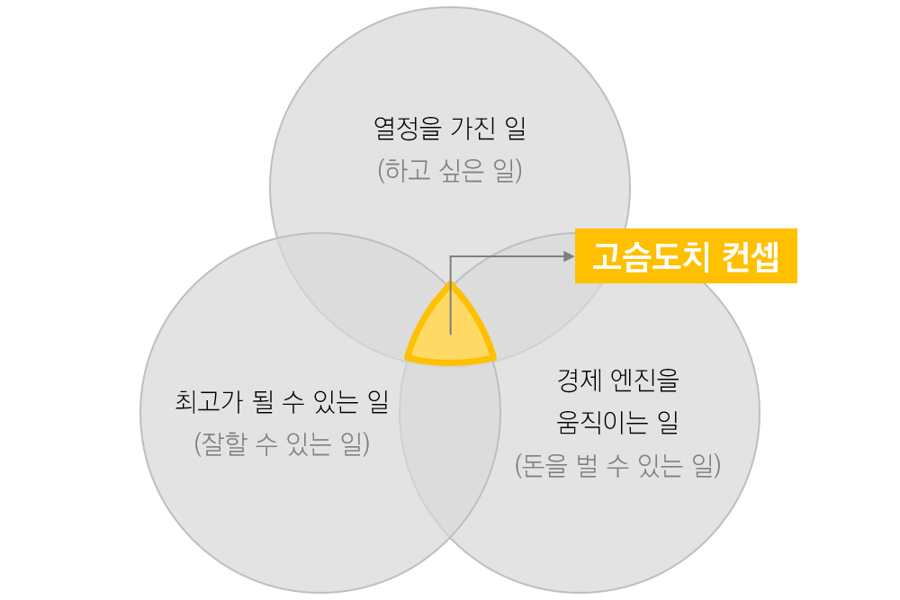 고슴도치 컨셉을 도출하는 방법은 외부에 보일 이미지나 회사의 자존심, 그리고 현재 수익 여부까지 내려놓고 오로지 '앞으로 우리가 무엇에서 최고가 될 수 있는지'를 찾아내는 것인데, 구체적으로는 다음 세 가지 기준이 일치하는 영역을 의미한다.