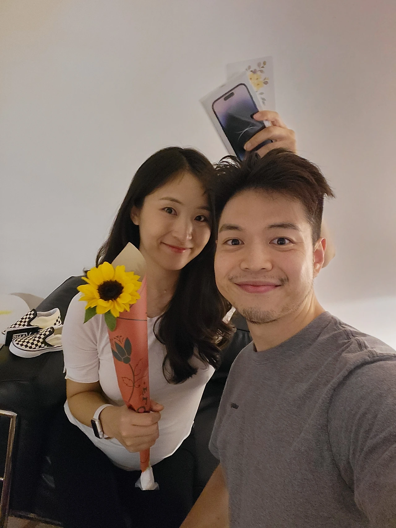 아무것도 아냐~ 하며 후다닥 방으로 들어가 작은 카드에 축하 메시지를 적고, 새로 산 아이폰을 포장했다. 그리고 선물 받은 해바라기 한 송이와 함께 아내에게 건넸다. 우와--!! 그녀는 얼굴 가득 함박웃음을 지었다. 미션 성공이었다. 참고로 아내는 이 글을 읽은 지금에서야 해바라기의 출처를 알게 될 것이다. 후후.