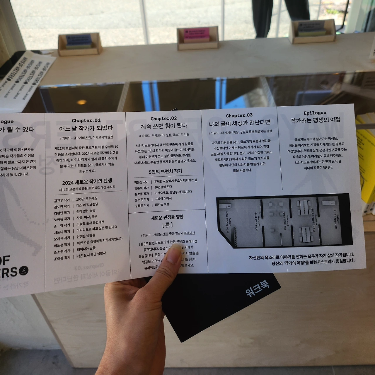 안내를 받고 팸플릿을 하나 받았다. 작가에게는 검은색 워크북을, 비작가에게는 하얀색 워크북을 준다.