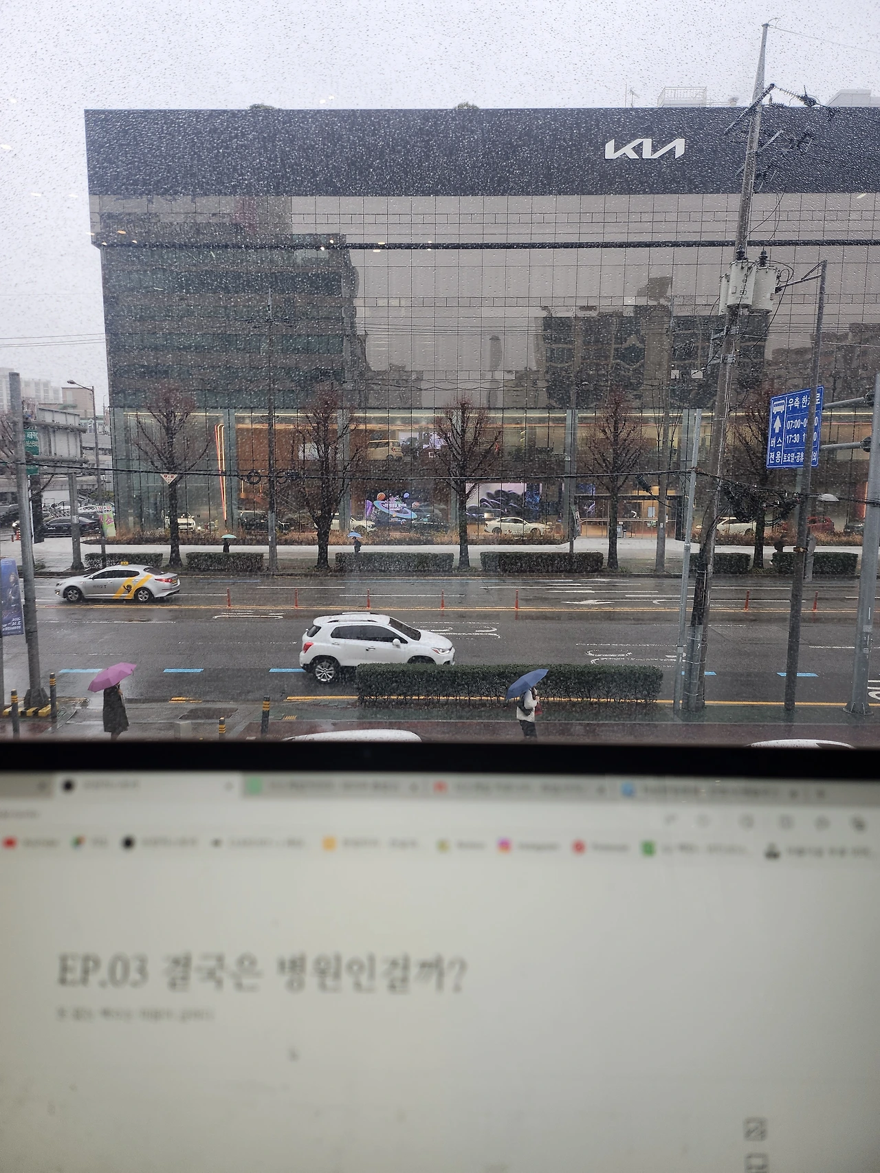 비 오는 수요일. 아침 아홉 시 운동을 마치고 점심 식사 후 스타벅스에 왔다. 앉고 싶은 자리가 있었는데 처음엔 차 있었으나 커피를 가지고 오자 비어 있어 곧장 옮겼다. 내리는 비가 환히 보이는 통창 앞의 나긋한 자리. 평소엔 앉지 않지만 오늘은 취미 생활을 하려고 이 자리를 노렸다. 아무도 나를 신경 쓰지 않겠지만 그래도 양 옆이 트여있는 자리는 내가 불편하다:)