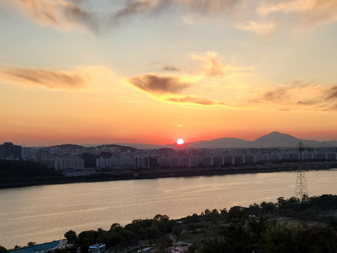 시간 가는 줄 모르고 걸었더니 어느새 하늘이 붉게 물들어오기 시작했다. 이젠 해가 짧아져서 오후 5시가 지나면 해가 조금씩 넘어가기 시작한다. 저쪽 하늘에서 해가 붉은빛을 가득 내뿜으며 서서히 지는 게 보였다. 하늘이 맑아 해가 지는 게 끝까지 보일 듯했다. 뉘엿뉘엿 지던 해가 어느 순간 모습을 감추더니 이내 하늘엔 붉은 노을이 가득 퍼지기 시작했다. 오랜만에 보는 서울 하늘의 일몰이었다.