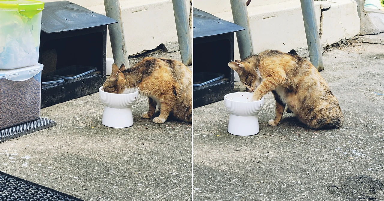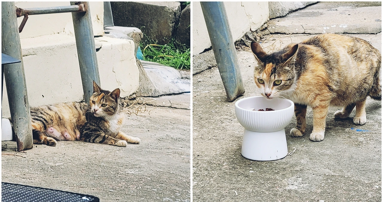 그런데 이 녀석, 자세히 보니 젖이 많이 부어있었다. 그러고 보니 배도 제법 나와있는 게 지금 임신 중이거나 최근에 새끼를 낳았던 녀석이 아닐까 싶었다. 그렇다면 아무래도 더 잘 먹어야 할 것 같아서 얼마 전부턴 습식사료에 건사료를 섞고 북어 트릿까지 올려 밥을 차려주고 있다. 첨엔 잘 먹으려나 걱정이 됐는데 다행히 입맛에 잘 맞았는지 녀석은 마치 설거지라도 하 듯 바닥까지 깨끗하게 핥아먹고 있다. 볼 때마다 무척이나 뿌듯하다.