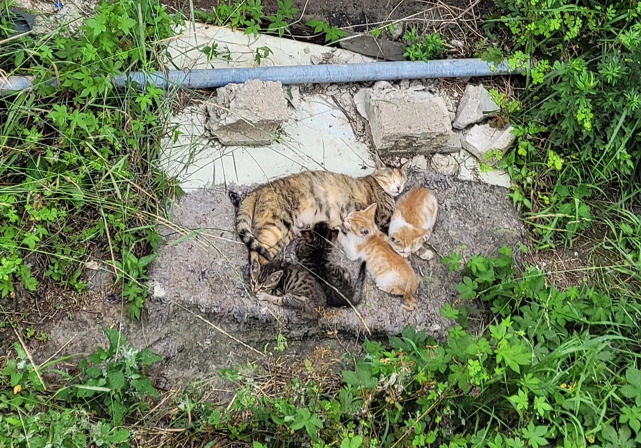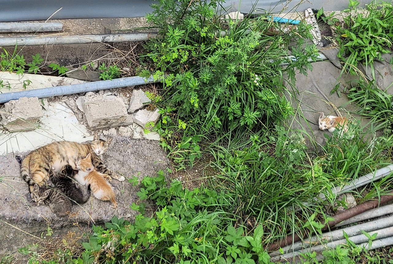 출산을 했더라도 얼마 되지 않았을 거라 생각했는데 처음 본 새끼냥들의 모습은 태어난 지 제법 시간이 흐른 것 같았다. 젖을 먹다가 '야옹'하고 삼색이를 부르는 내 목소리에 놀란 치즈냥 한 마리가 후다닥 몸을 숨기러 뛰어갔다가 나와 눈이 마주쳤다. 다른 고등어 한 녀석도 젖을 먹다 나를 바라봤다.