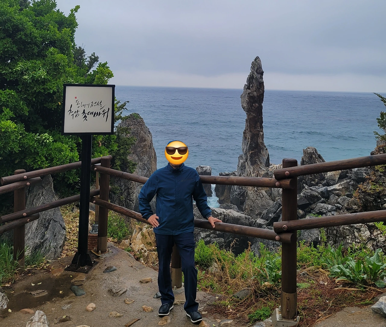 계단을 한 5분쯤 올라가니 촛대바위가 보이는 곳까지 도착할 수 있었고 그곳엔 사진을 찍으려는 사람들이 줄을 서서 차례를 기다리고 있었다. 우리 가족 중에는 아빠만 독사진을 찍으셨다. 이런 곳에 오면 인증샷을 남겨야 한다는 말씀과 함께.
