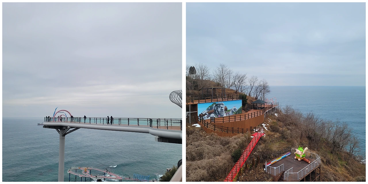 구경을 마치고 이번 여행의 마지막 목적지인 묵호항으로 향했다. '도째비골 스카이밸리'라는 곳이 있어서 왔는데 주차를 하고 보니 저 언덕 위에 있는 스카이워크가 눈에 들어왔다. 언덕을 올라가 유료 엘리베이터를 타고 올라가니 묵호항 앞바다가 훤히 보이는 스카이워크에 도착할 수 있었다.