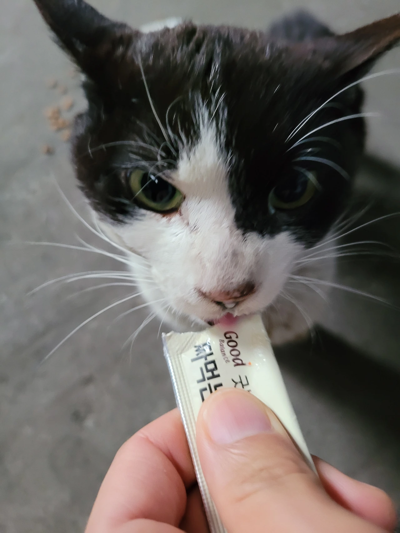 이때다 싶어 가방에서 참치 맛 츄르를 꺼내 녀석을 유혹해 본다. 냄새가 퍼져 나가길 바라며 츄르를 살살 흔들고 "야옹, 야옹" 녀석을 나직이 불러봤더니 세상에나, 고개를 빼꼼 내밀고 내게로 찬찬히 다가온다. 그리고는 츄르 냄새를 맡아보고선 혀로 한번 먹어본다. 맛이 괜찮았는지 혀를 계속 날름거리기 시작했는데 먹기 편하도록 천천히 짜주었더니 움직이지도 않고 곧잘 받아먹는다.