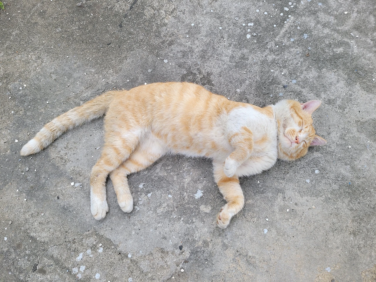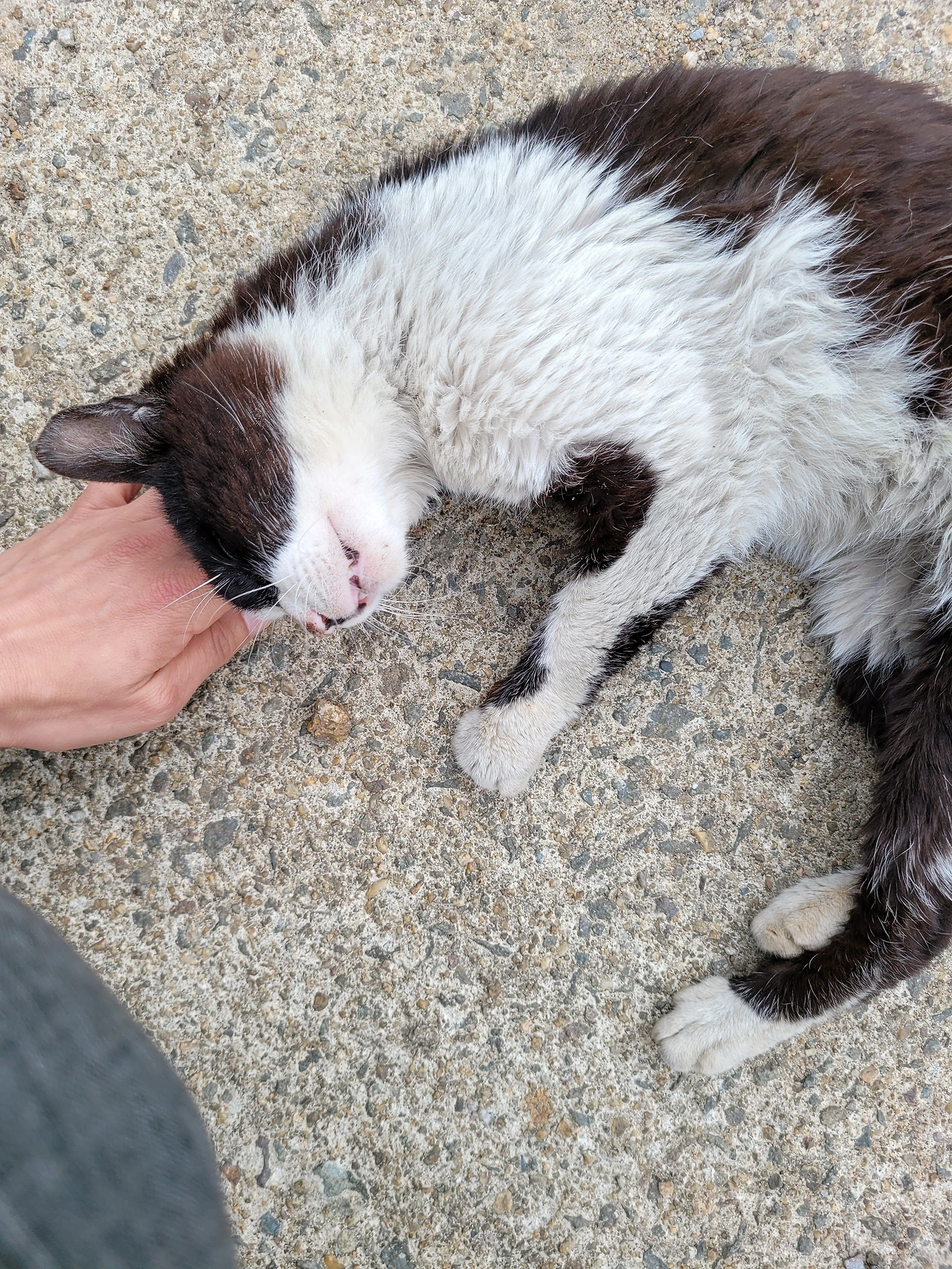 분홍 젤리가 오동통하게 붙어있는 손으로 부지런히도 온몸을 핥아대던 이 녀석. 분명 날 처음 보는데도 도망가지 않고 약간 쉰 목소리를 내며 그 자릴 지키고 있었다. 길고양이들은 대부분 낯선 사람을 경계하는 것으로 알고 있던 나는 조금 당황스럽긴 했는데 눈을 감고 누워있는 모습이 너무 순해 보여 내 냄새를 맡게 해 주려 손을 뻗었다가 바로 냥펀치를 한대 맞고야 말았다.