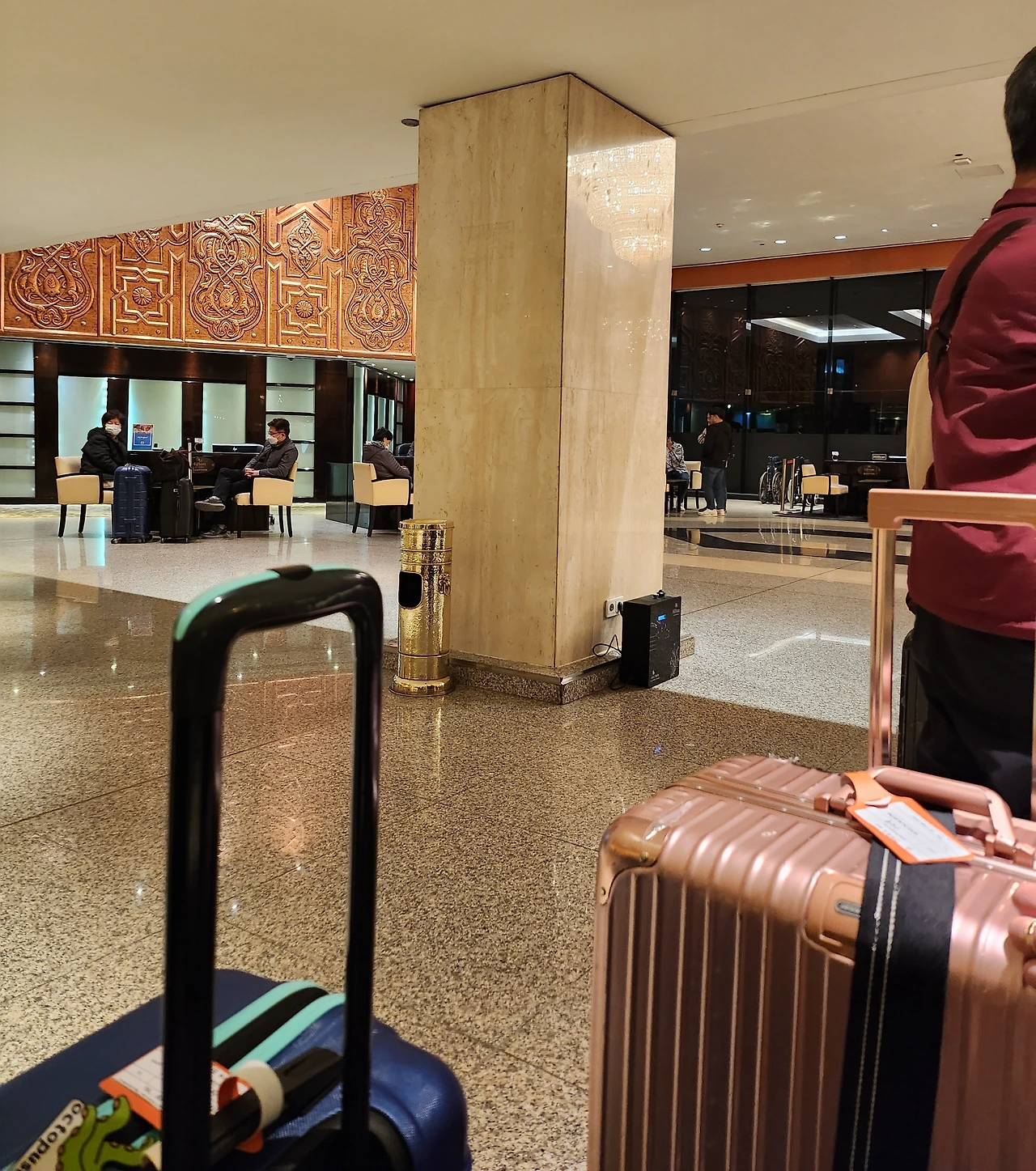 잠시 후에 가이드가 지역 가이드가 명단을 잘못 제출해서 우리 명단이 아닌 다음팀 명단이 들어가 있어 확인과 수정 작업에 시간이 걸린다고 한다. 이미 체력이 소진상태인데 기다려야 한다니. 할 수 없이 우리 일행은 로비에 난민처럼 늘어져 있었다. 조용한 로비에 그것도 새벽 한 시 반에 묘한 웃음소리가 매우 크게 고요를 흐려놓았다. 그 웃음소리는 계속 이어져 피곤해서 날카로워진 신경 줄을 몹시 화나게 하고 있었다. 옆에 바에서 아랍인으로 보이는 다섯 명이 술을 마시면서 떠들고 웃으며 내는 소리였다. 안내에 가서 조용히 해 줄 것을 부탁했다. 조금 조용한 것 같더니 더 큰 소리의 웃음이 정적을 가로질러 날아왔다. 그것도 계속되었다. 이래저래 참고 있던 일행 중 부산 아지매가 벌떡 일어나더니 그곳으로 다가가서