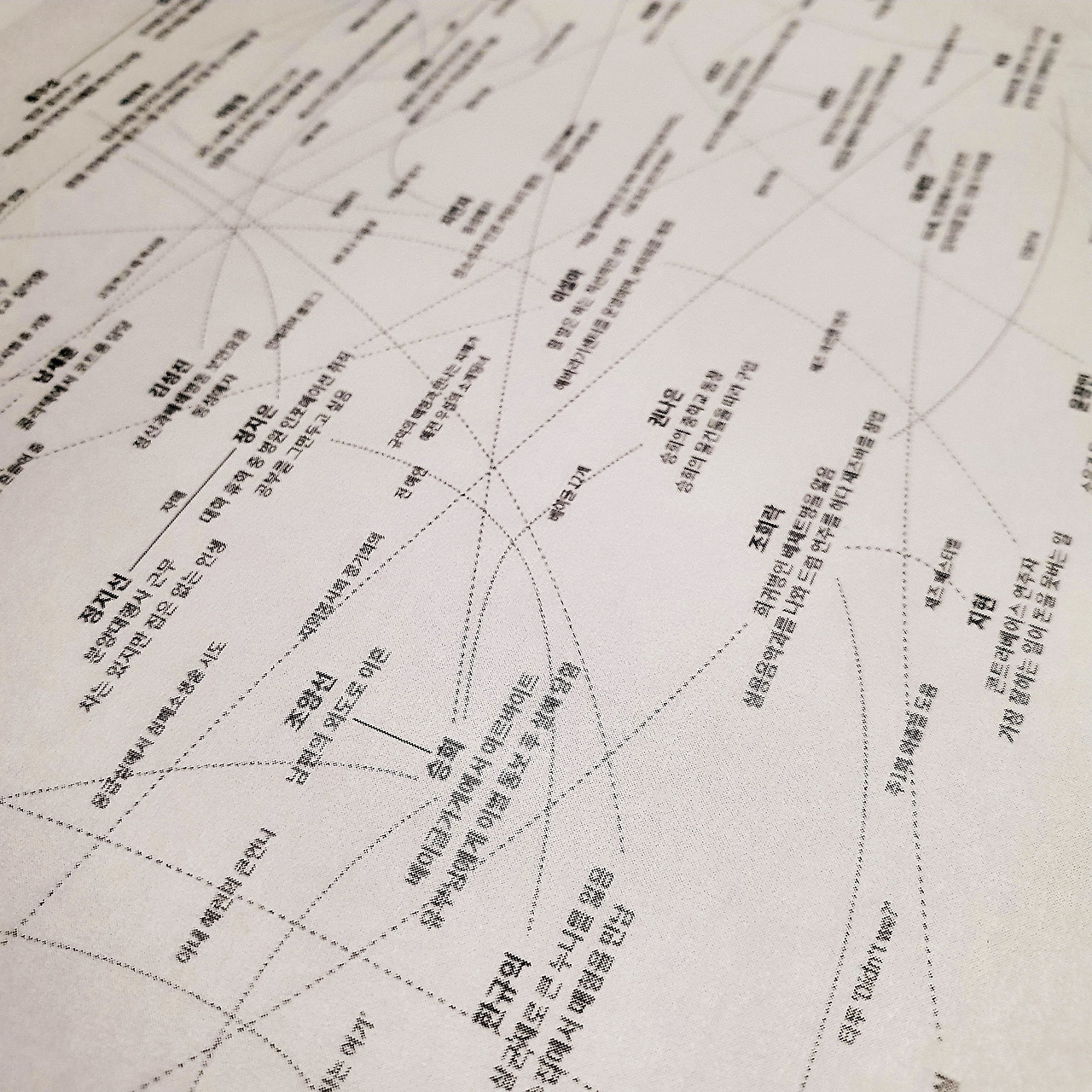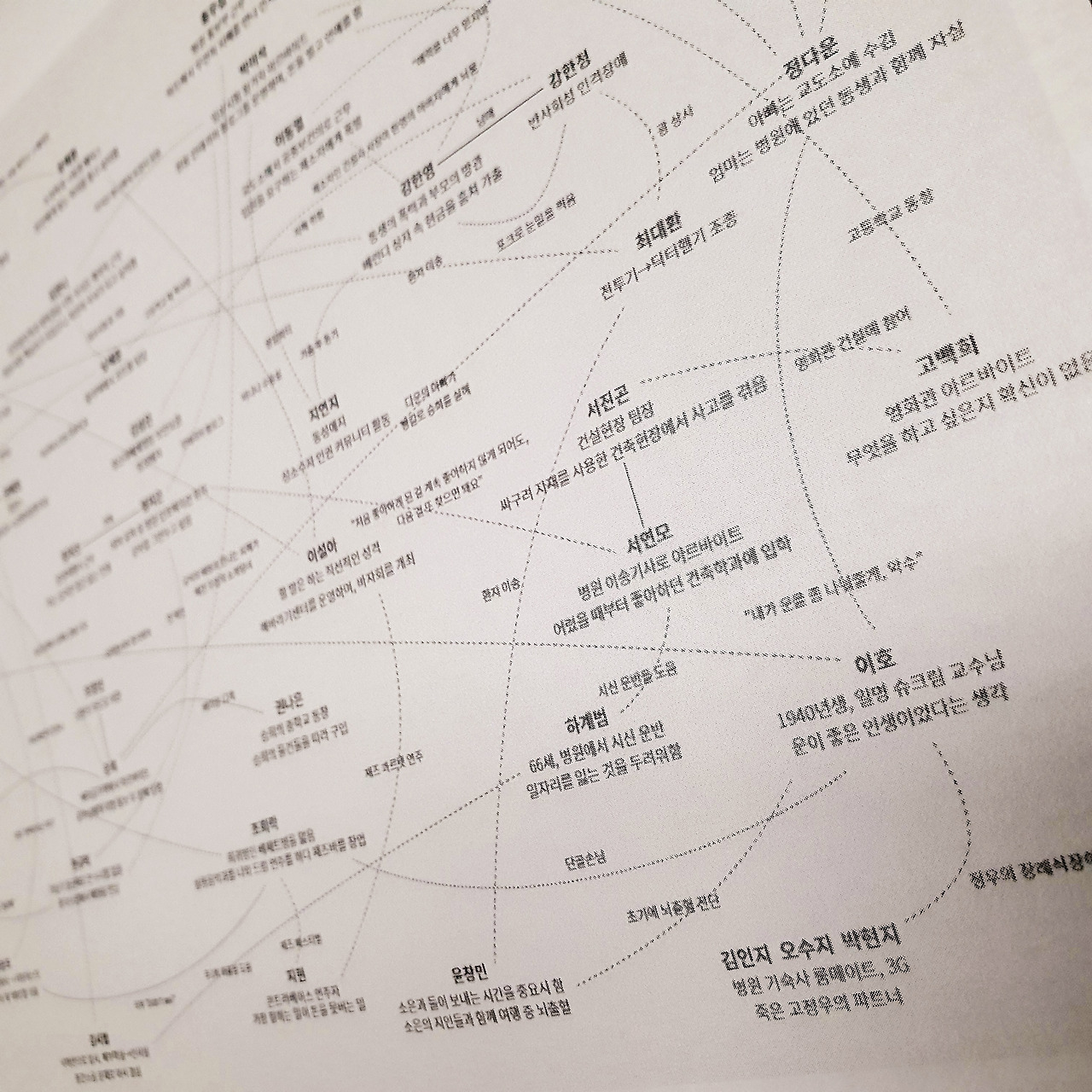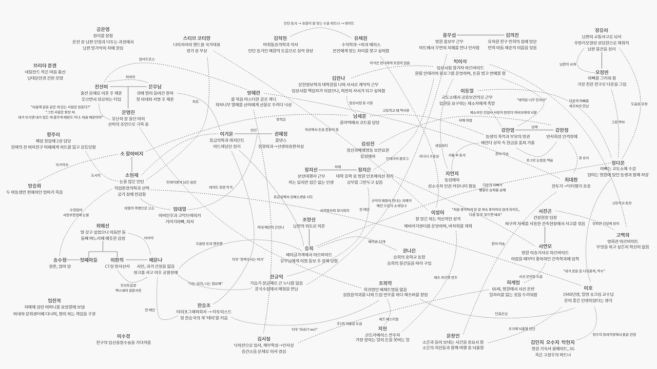 책을 모두 읽고 나서 자연스럽게 커다란 종이를 꺼내 펼쳤다. 수차례 썼다 지웠다를 반복해야 할 것을 알기에 부드러운 지우개와 옅고 단단한 심도의 뾰족하게 깎은 연필도 함께 꺼냈다. 다시 책의 첫 장을 펼치고, 종이에 등장인물의 이름을 썼다. 바로 아래에는 그의 삶을 한두 줄로 간략하게 요약했다. 그리고 다음에 등장하는 인물도, 그다음 인물도... 그러다 보면 이 사람과 저 사람이 연결된다. 부부나 모녀, 자매와 같은 가족이거나 직장동료처럼 비교적 그 연결고리가 명확한 경우도 있지만, 말 그대로 스쳐 지나가는 인연이었다거나 건너 건너 아는 사이인 경우도 허다하다. 처음 읽을 때보다 두 번째 다시 읽으니 숨겨졌던 관계들이 더욱 많이 드러나는 듯했다. 그렇게 종이를 가득 채우고, 노트북으로 옮겨 담았다.
