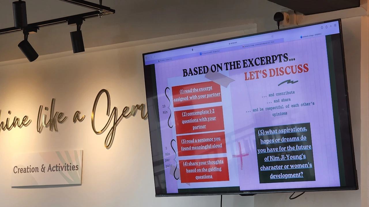 워크숍은 세 부분으로 구성되었다. 먼저 첫 번째로, 1982년생 김지영 발췌문 낭독 및 토론을 진행하였다. 싱가포르 여성이 보는 한국 여성은 어떠한지 궁금하였기 때문에 진행하기 되었고, 서로의 삶을 비교 분석해보고 싶었다. 정말 재밌었던 점은 그들은 이미 이 책을 읽었고, 싱가포르에서도 항상 베스트셀러로 자리 잡은 책이라 한다. 그리고 한국 친구들이 있거나 한국을 방문한 적이 종종 있어서 우리의 문화를 많이 알고 있어서 비교적 편하게 토론을 진행할 수 있었다. 그리고 그들의 열띤 목소리는 더욱이 인상적이었다. 아시아 여성으로서 받았던 차별과 힘든 시기들을 이미 겪어낸, 그리고 차마 내가 경험하지 못했던 것들을 간접 경험함으로써 나 또한 좁았던 하나의 세계가 변하는 듯하였다.