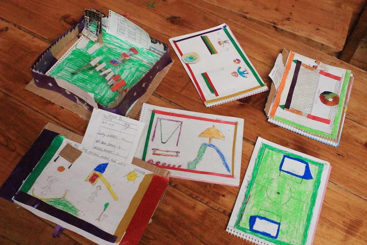 그리고 마침 워크숍을 추가로 진행할 시간이 생겨 도서관에서 오는 11살 친구들 대상으로도 워크숍을 진행할 수 있게 되었다. 같은 내용이지만 재료는 조금 다르게 진행을 해보았다. 최대한 케냐에서 쉽게 구할 수 있는 재료를 활용해 색연필과 스티커 그리고 안 쓰는 박스들을 사용해 업사이클링(Upcycling) 개념을 알려주며 진행해 보았다. 그리고 청소년이라고 말할 수 있는 나이가 왔기에 개별로 발표하기엔 약간의 부끄러운 모습들을 보였기 때문에 팀별 활동을 진행하였다. 처음에는 어떻게 만들지 몰라서 조금 걱정하는 눈치였지만 곧 재미있게 몰두하기 시작했다. 친구들과 협력해서 그네와 미끄럼틀, 축구장 등등을 그리기 시작되었고 조금 더 잘할 수 있게 격려를 해주니 금세 자신감이 붙어 즐겁게 만들어냈다.