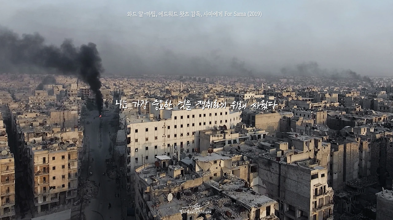 다시 알레포로 돌아가도, 대학생 시절로 회귀한다고 해도 그녀는 똑같은 선택을 할 것이라 말한다. 너무나 자연스러웠던 와드의 음성이 마음속에서 떠나지 않는다. 그 말이 얼마나 어렵고 또 어려울지, 우린 상상할 수 없으니까. 수많은 선택이 '지금의 나'와 '앞으로의 나'를 결정한다는 것을 모르지 않는다. 그럼에도 불구하고 쉽게 말할 수 없는 까닭은 변하지 않는 신념을 품고, 마지막까지 저항한 와드의 불변한 삶의 자세가 그저 대단하기 때문이다. 갓 태어난 아기가 시원하게 울음을 터트렸을 때를 평생 잊을 수 없는 것처럼 그녀의 인생은 한없이 강렬했다. 사마와 같은 아이들을 위해, 자유를 위해 싸웠던 와드가 사마를 안고 알레포 거리를 걷자, 카메라가 길게 위로 뻗어나간다. 알레포의 전경이 보이고, 모녀의 모습이 새까만 점으로 보일 때쯤, 우린 와드가 보낸 러브레터의 또 다른 수신자가 바로 나였음을 깨닫는다. 고맙게도.