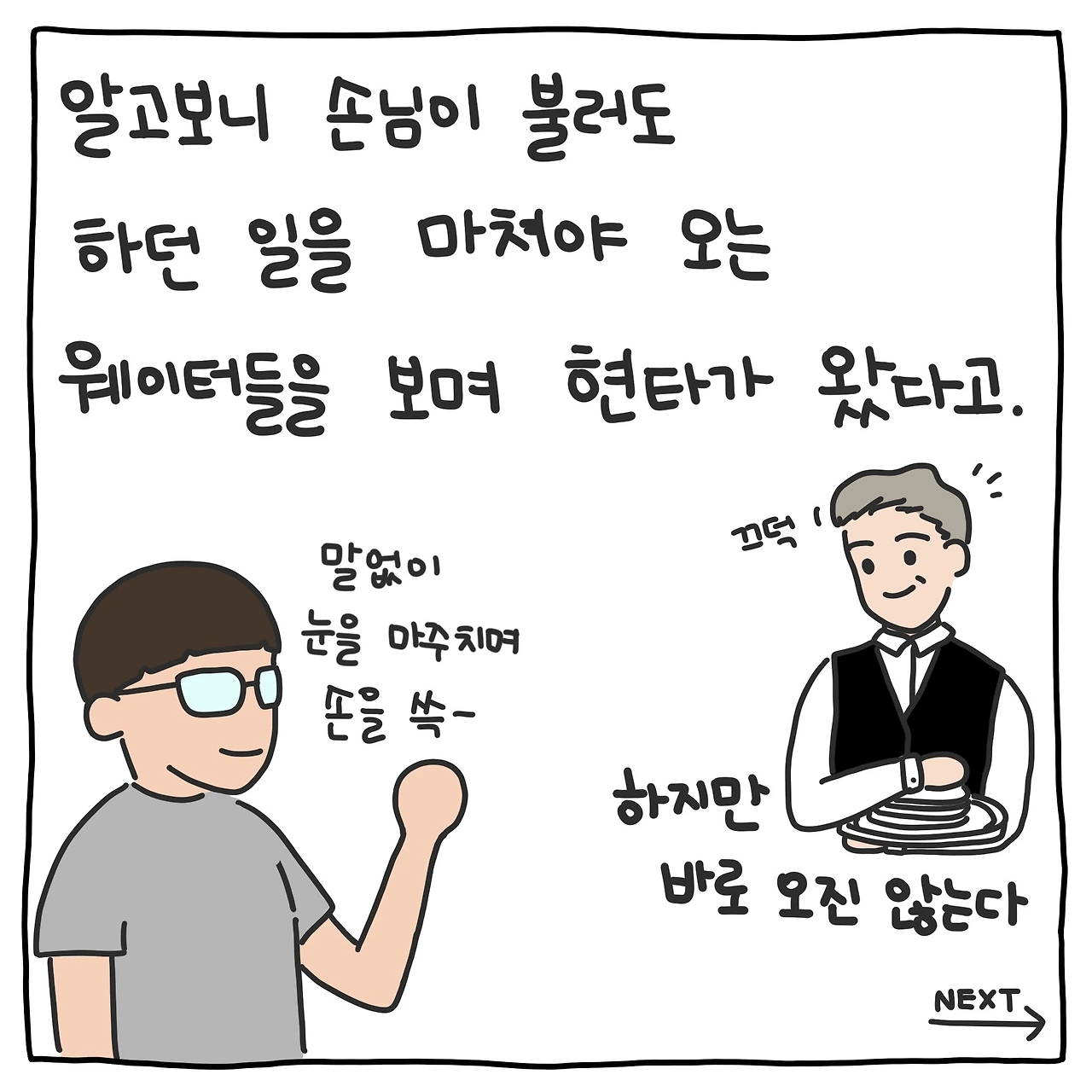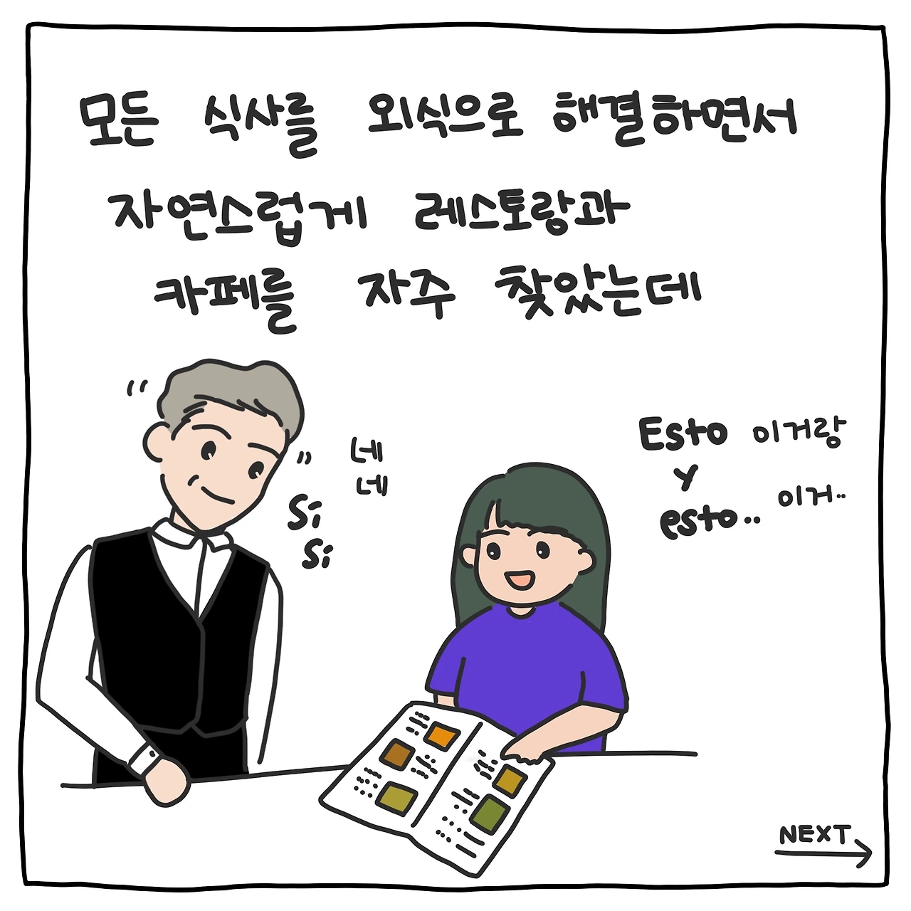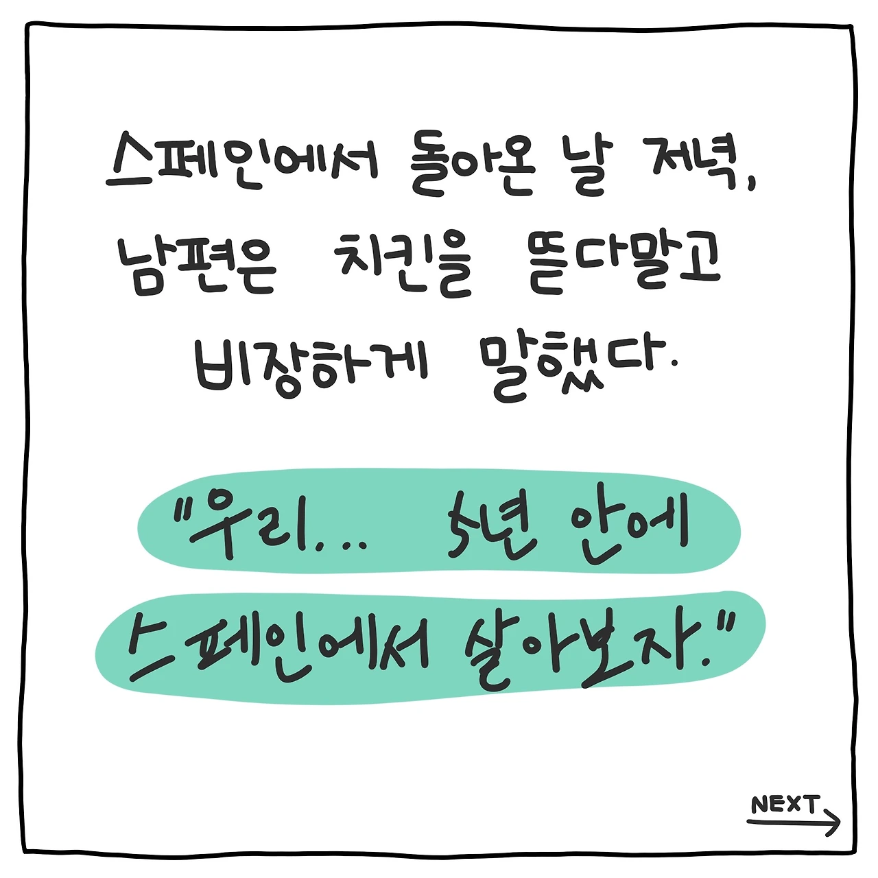 때는 저희가 첫 스페인 여행을 떠났던 2016년. 난생처음 가본 유럽에서 저희는 한 번도 경험해보지 못한 서빙 문화를 경험하는데요. 그것은 바로 손님이 왕이 아니라는 것!이었습니다. 웨이터를 불러도 모든 걸 내버려 두고 바로 뛰어오는 게 아니라 자신이 할 일을 마무리 짓고 오는 모습을 보며 자신의 우선순위와 업무 처리 방식을 되돌아보게 된 남편 윤님은 저에게 아주아주 큰 폭탄을 던지죠!