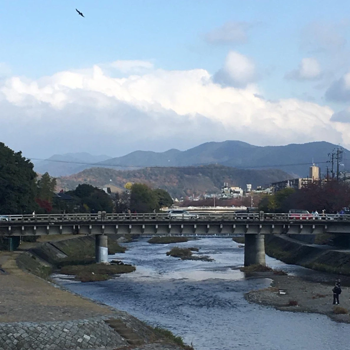 11월의 교토는 조금 쌀쌀하지만 많이 춥지는 않았다. 하늘이 맑았고 바람은 조금 불었지만 호스텔의 자전거를 대여해 다니기로 했다. 첫 번째 장소로 가는 길에 카모 강을 건넜다. 카모 강은 교토의 유명한 강으로 이 지역 사람들의 사랑을 받고 있는 곳이다. 어느 지역이든 강이 있다면 그곳은 쉼터가 되고 만남의 장소가 되는 듯하다.