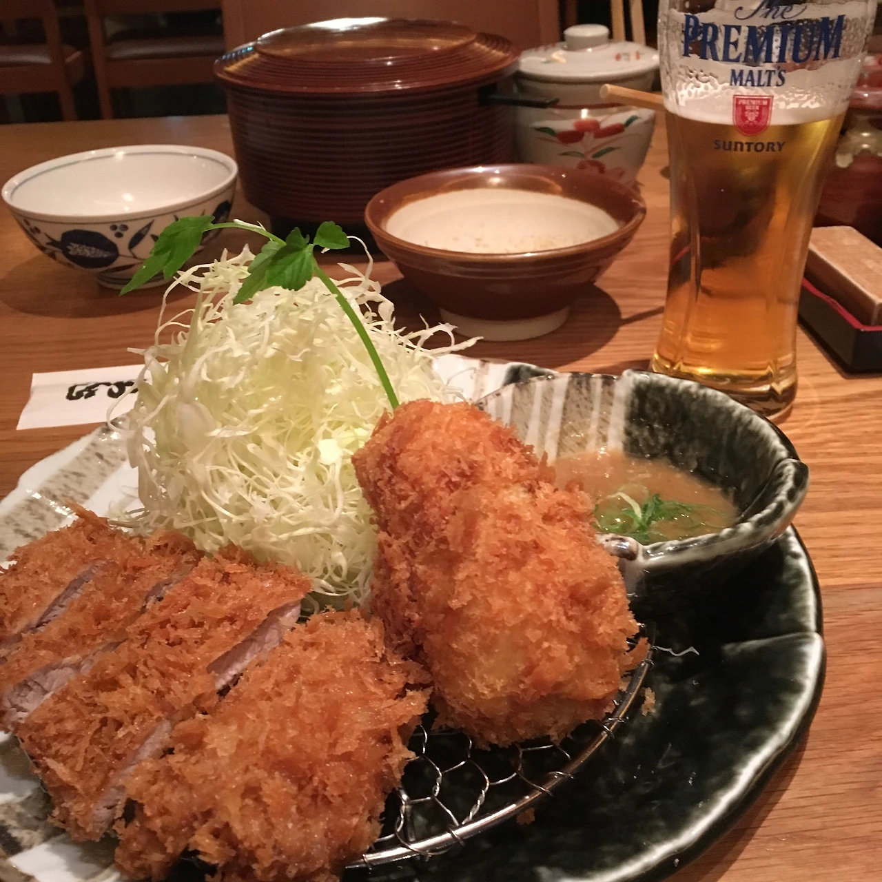 친절한 직원의 안내를 받아 자리에 착석한 후 주문을 했다. 등심과 안심이 함께 나오는 돈가스와 생맥주를 주문했다. 튀김은 무조건 생맥주, 저녁엔 무조건 생맥주! 깨를 갈아 소스를 붓고, 갓 튀겨져 나온 따끈한 돈가스 한입, 생맥주 두 모금. 이것은 환상의 조합이다. 난 일본의 돈가스와 새우튀김(에비후라이)를 참 좋아한다.