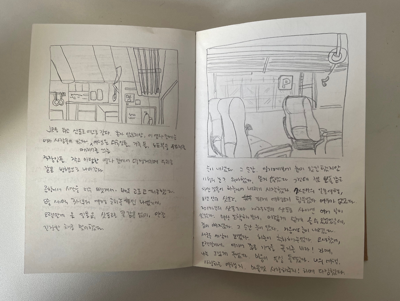 비행기가 하늘로 떠올랐다. 1시간 50분이면 신치토세 공항에 도착한다고 한다. 체감은 기차보다 느린데 어떻게 그렇게 빠르게 도착할 수 있는지 궁금하다. 사실 일본은 내가 생각하는 것보다 더 가까이 있는 걸까. 비행기 안은 만석인 듯 보였다. 모두들 나와 함께 삿포로에 간다. 옆 자리의 할머니 할아버지는 아들과 함께 온 것 같다. 저 멀리 아기도 있는 것 같다. 우리가 여행을 하는 동안 또 마주칠지 궁금하다. 다들 어떤 계획을 세우고 이 비행기에 몸을 실었는지, 당신들은 이 여행이 설레는지, 아니면 나처럼 어색한지.