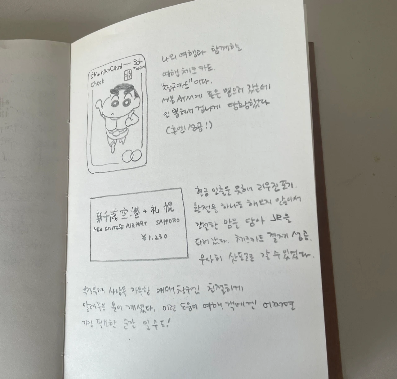 2시간 정도의 비행이 끝나고 신치토세 공항에 도착했다. 나는 순서를 기다렸다 뒤도 안 돌아보고 캐리어를 끌어 나왔다. 공항에 내리면 조금은 실감이 날까 싶었다. 나 오랜만에 기다리고 기다리던 여행을 왔어, 꿈꾸던 순간이야, 하며 낯선 땅의 공기를 가득 느끼고 싶었다. 군데군데 적힌 일본어 광고 표지판이 보이고 안내문이 보였고 정신없이 지나 현금 인출기를 찾았다. 환전을 하나도 해 오지 않았기에 바로 현금을 뽑아 공항 리무진을 탈 예정이었다. 리무진 출발 시간이 얼마 남지 않아 조금 조바심이 났다. 예약한 호텔은 나카지마 공원 근처의 호텔인데 근처로 가는 리무진은 하루에 몇 대가 없었다.