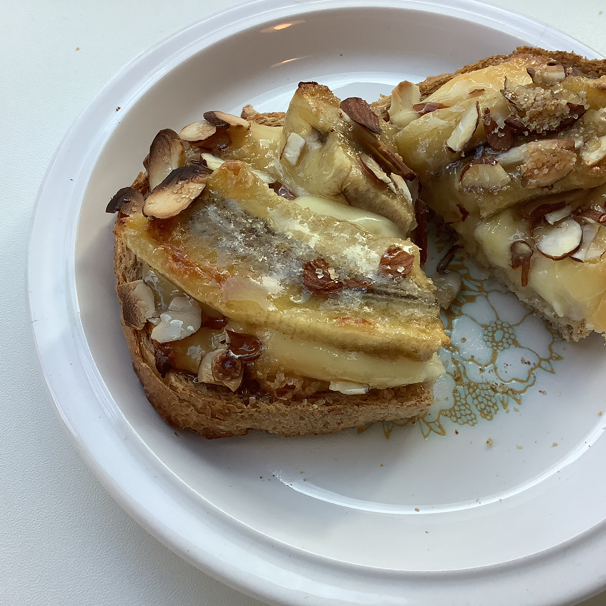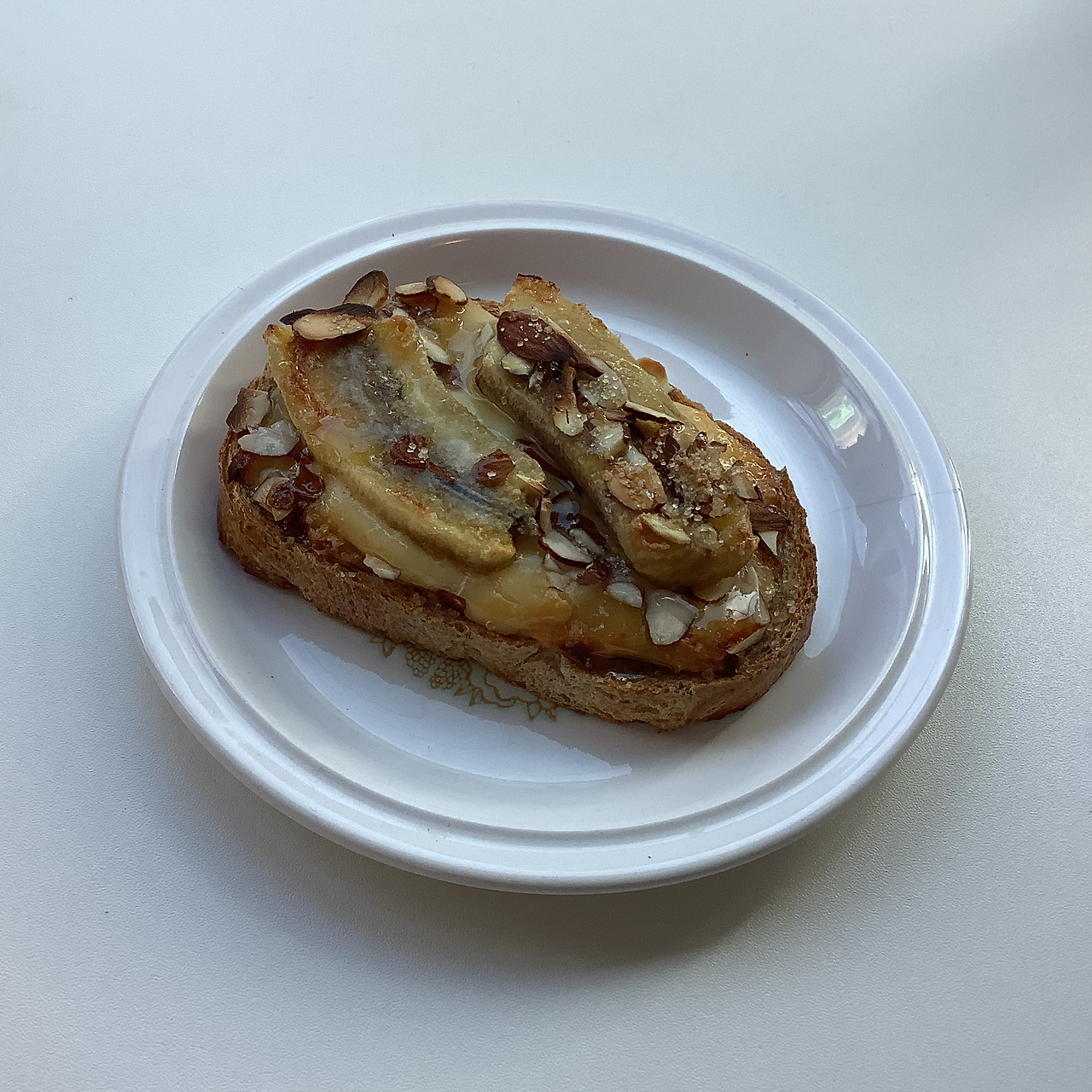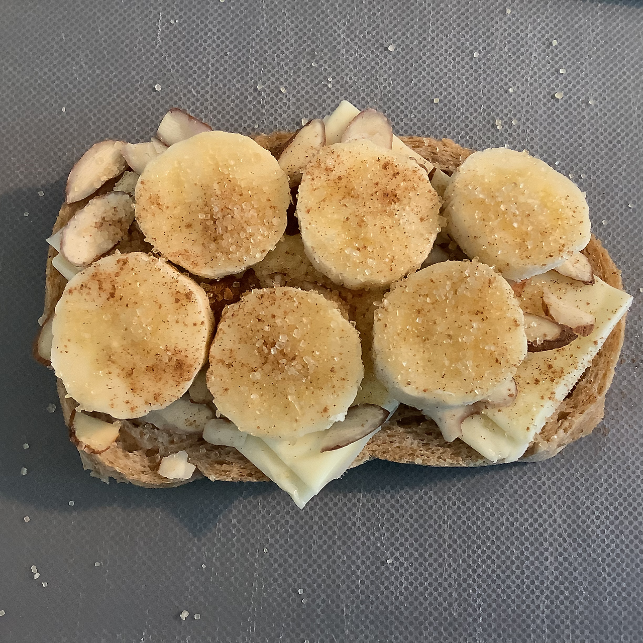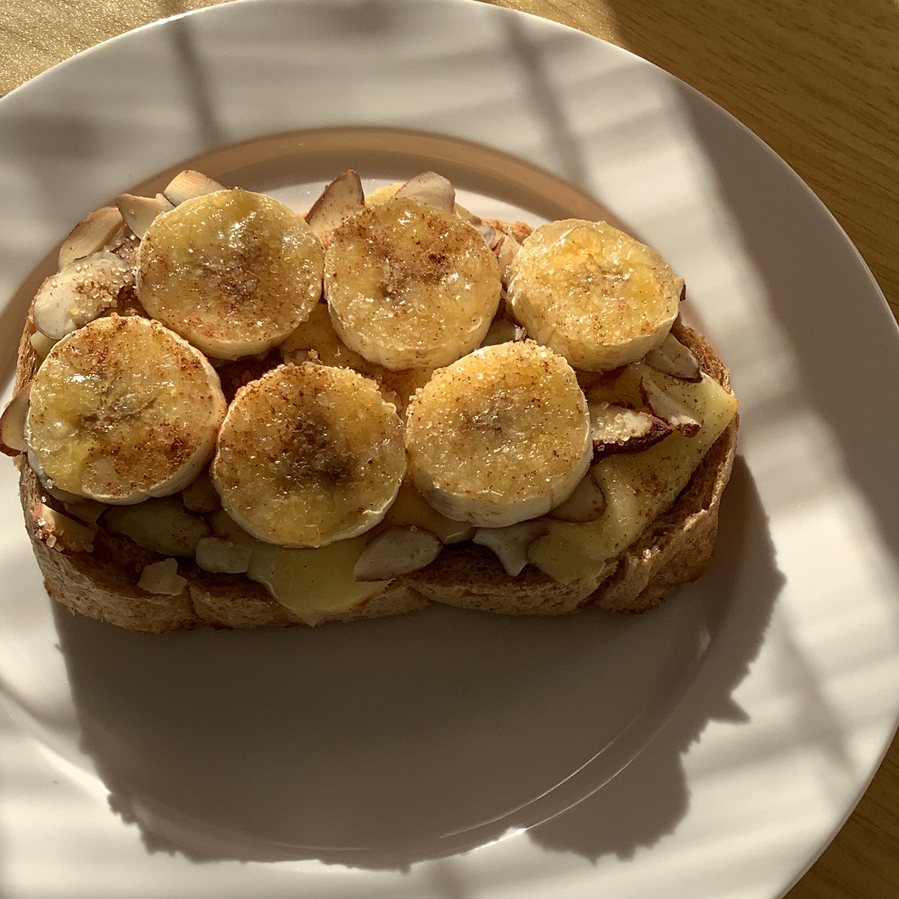 오븐 속에서 빵은 바삭하게 구워지고 치즈는 녹는다. 바나나는 물렁해지며 더 강한 단맛을 뿜어낸다. 슬라이스 아몬드는 바삭해지고, 설탕도 살짝 녹으며 더 달콤하고 향긋한 냄새를 풍긴다. 10-15분 정도 구운 다음, 그 위에 시나몬과 아주 소량의 꿀을 뿌렸다.