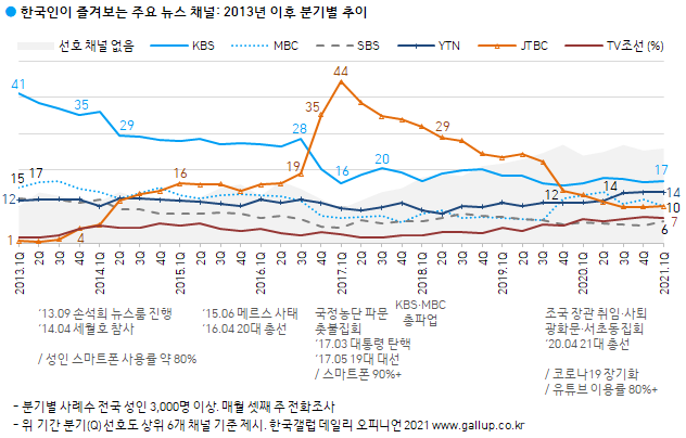 한국갤럽 통계에 따르면 10%에도 못 미치던 선호도가 2014년 2분기 세월호 보도를 거치며 15%를 상회했다. 통계 상으로는 2016년 10월 26일 태블릿 PC 보도 이후인 2016년 3분기에서 조국 사태가 있었던 2019년 3분기 전까지가 JTBC의 최전성기였다. 국정농단 정국에선 44%라는 수치를 기록하기도 했으니 말이다. 그 후 조금씩 선호도가 하락하더니 조국 사태 보도 이후 팍 꺾였다.