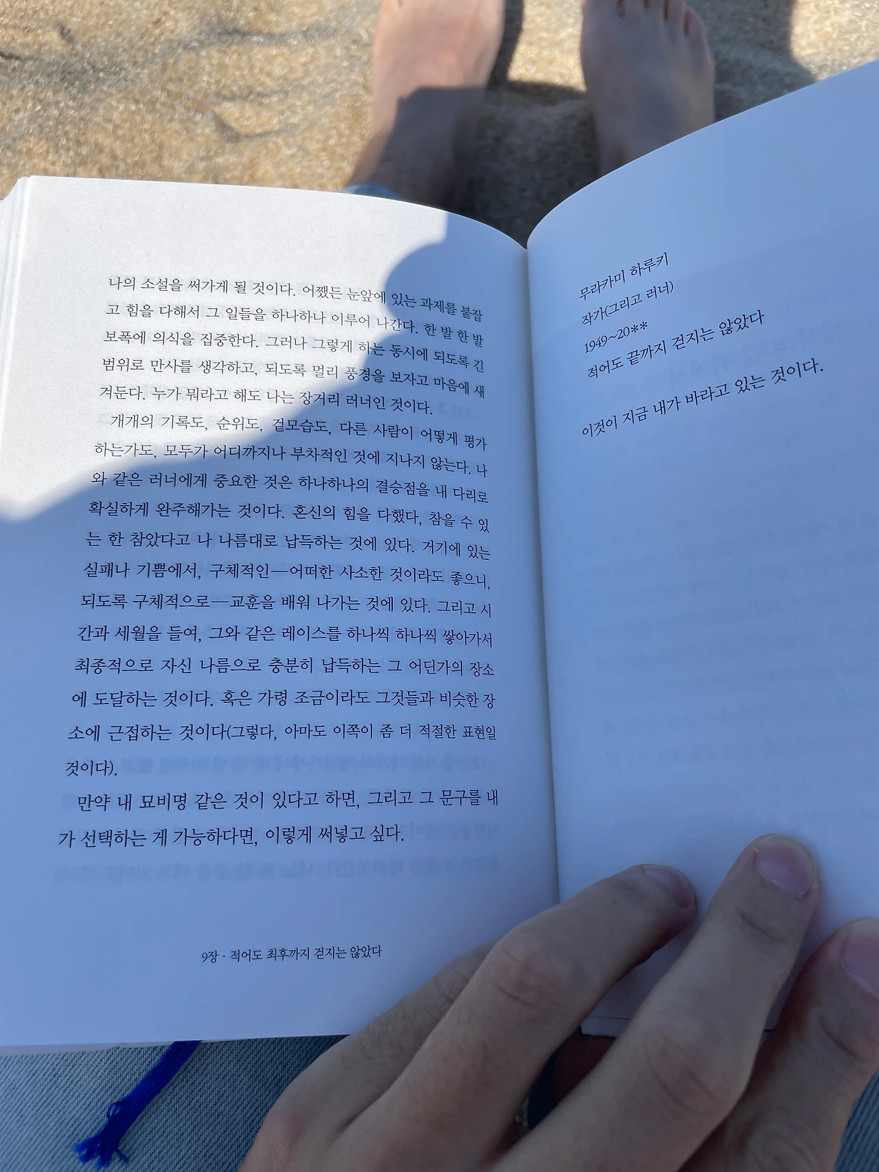 이 글을 읽는 장소는 강릉 앞바다 해변가였고, 파아란 바다와 하늘이 배경이 되어주고 있었다. 그래서였을까, 근래 내 머릿속의 많은 중요했던 것들이(정확히는 중요하다고 착각했던 것들이) 중요하지 않게 되었고, 진실로 중요한 것들만이 머릿속에 남게 되었다. 바닷가에 누워 책을 읽는다는 행위도 자연스레 명상적으로 변하고 있었다.