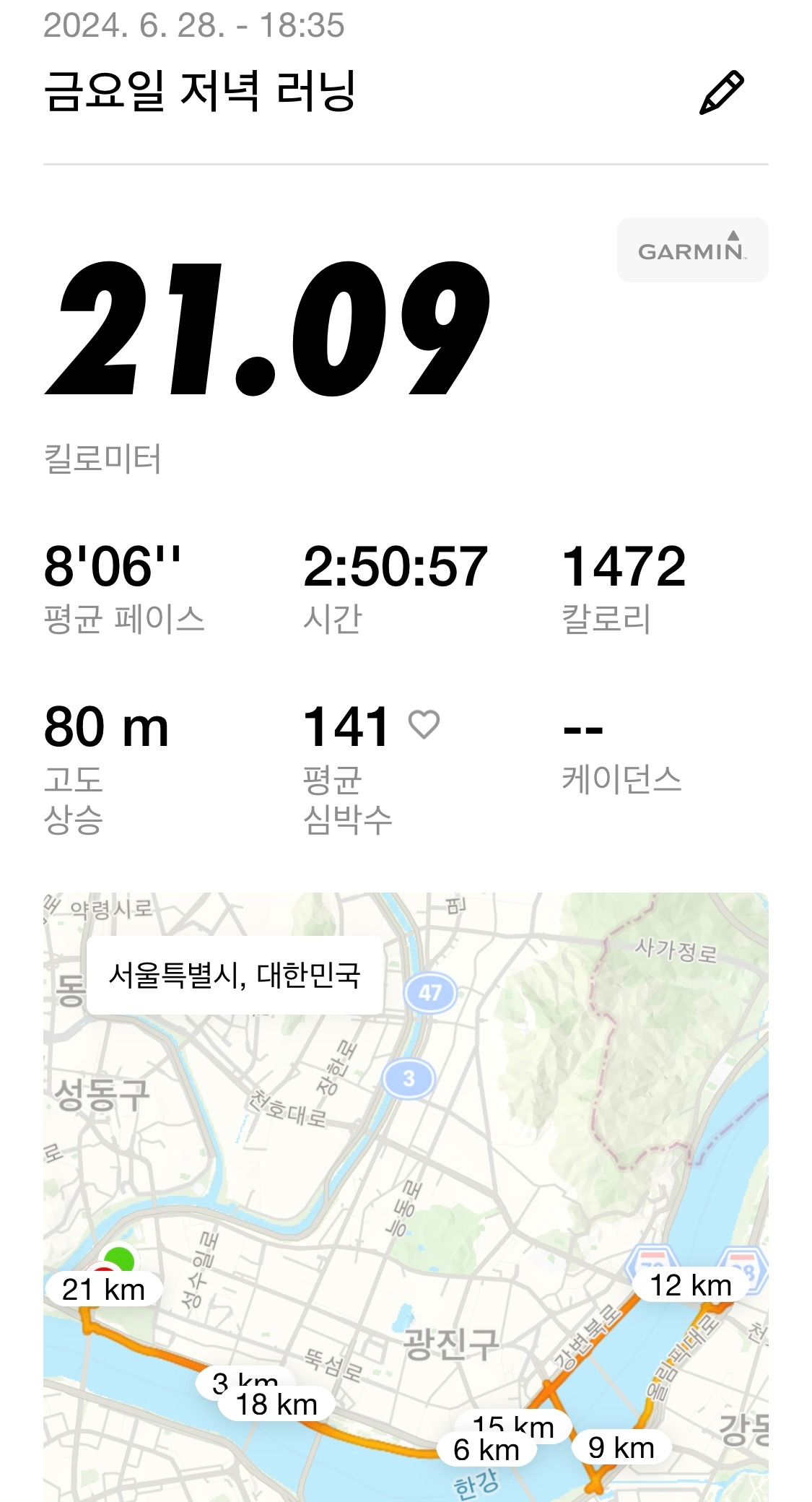5월에 15km를 달릴 때는, 급작스러웠다. 그저 핸드폰, 에어팟, 교통카드 하나 들고 출발한 달리기 여정이 평소보다 길어질 수 있겠다는 느낌이 찾아온다. 나의 컨디션, 새로운 길, 날씨를 느끼면서 오늘은 조금 더 길게 다녀와야겠다고 다짐했고, 뛰다 보니 15km를 목표로 잡았었다.