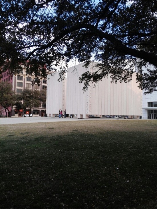 다시 걷습니다. 한 블록을 지나니 붉은 색의 멋진 건물이 보입니다. 텍사스 역사를 고스란히 보존하고 있다는 올드레드 뮤지엄(Old red museum). 텍사스 역사를 알 필요가 뭐 있노, 콧방귀 끼며 모퉁이를 돌아가니 이번에는 나무 사이로, 두둥! 한 눈에 주목을 끄는 대담한 디자인의 조형물이 서있는 게 아닙니까. 존 에프 케네디 메모리얼 플라자(J. F. Kennedy memorial Plaza)입니다.