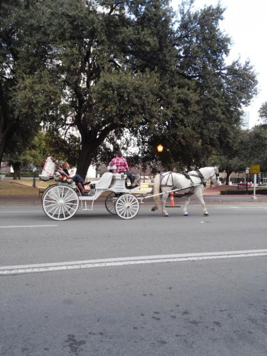 현재 시각 일요일 오후. 댈러스는 도심공동화 현상의 완벽한 표본입니다. 고층빌딩이 밀집된 다운타운에 개미새끼 한 마리 찾아볼 수 없… 지는 않고 관광객 풍의 할아버지 할머니 몇 분만 이리저리 왔다 갔다 하시는군요. 관람 마차 끄는 흰색 말이 푸르륵 푸륵 콧김 내뿜으며 다가와 말합니다(사진 1). "부산에서 바보는 텍사스에서도 바보군."