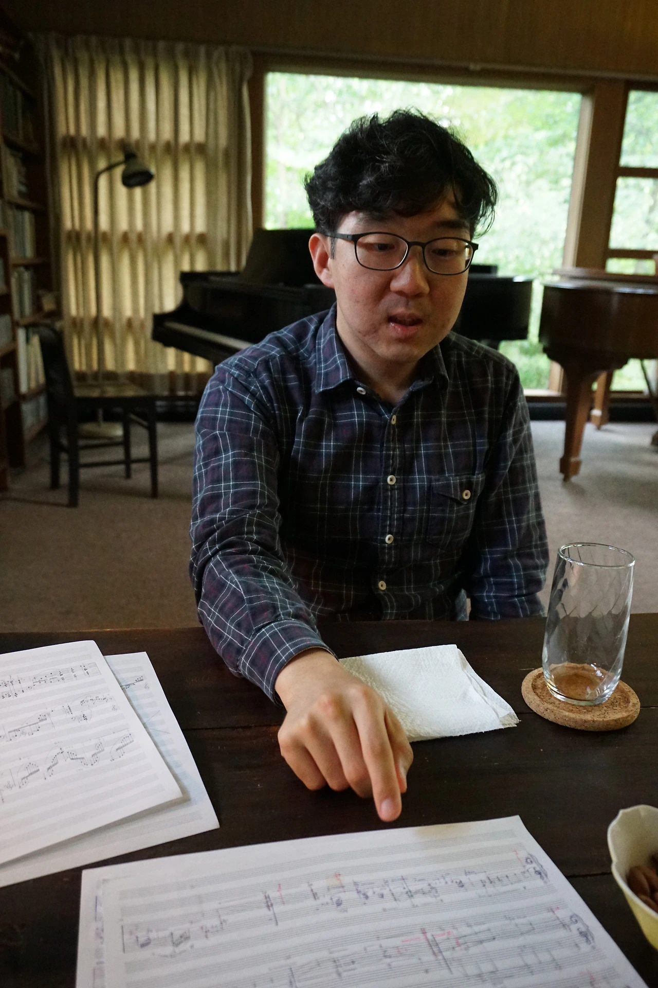 지난 7월 레지던시를 가졌던 작곡가 김택수를 만나기 위해 코플랜드 하우스를 찾았다. 마침 그는 평창 대관령음악제로부터 위촉받은 ‘평창을 위한 팡파르’를 완성해 한국으로 보낸 직후였다. 그래서인지 약간의 여유가 느껴졌다. 그의 안내로 코플랜드 하우스 내부를 둘러보다가 우연히 김택수의 자필 악보를 보게 되었다. 최종본이라도 해도 될 정도로 매우 정교하게 만들어진 예술 작품과도 같은 악보였다. 그는 제일 처음 손으로 그린 스케치를 여러 단계에 거쳐 수정 보완하는 과정을 거쳐 작곡을 진행한다. 그런데 최종본을 위해 악보를 컴퓨터로 입력하는 과정 직전에 다시 한번 스케치 최종본을 작성한다고 했다. 잠시 스쳐간 영감의 흔적조차 꼼꼼한 기록으로 남겨두려는 치밀한 그의 의도가 엿보였다.